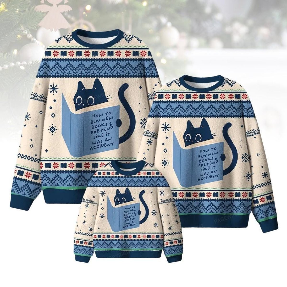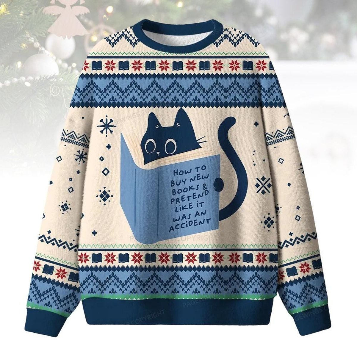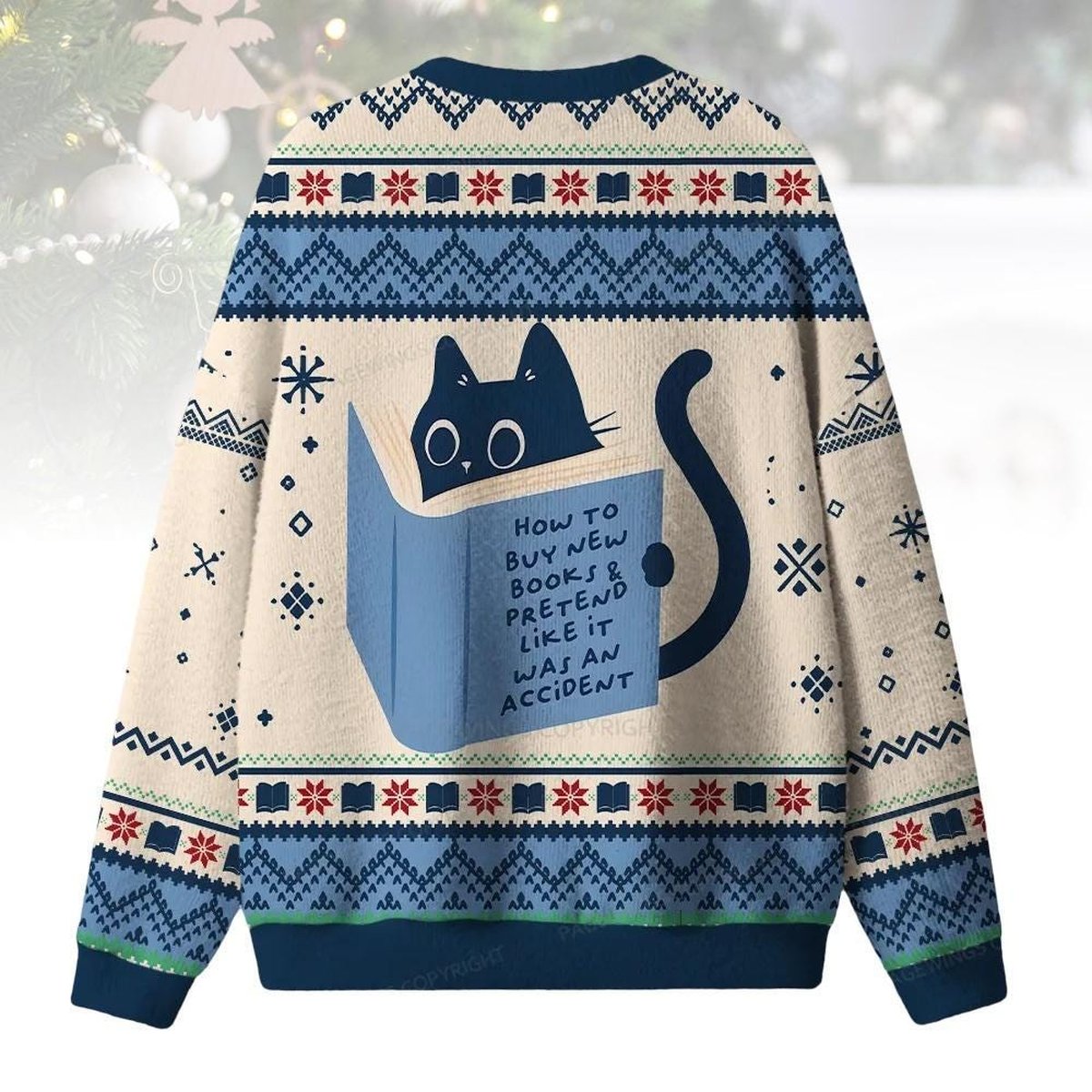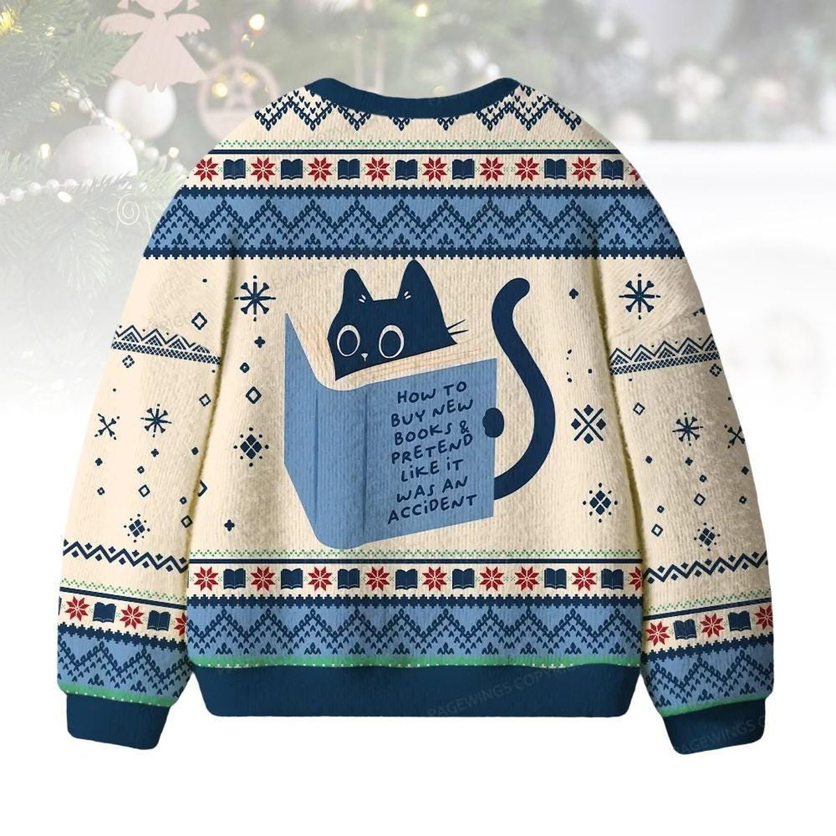 Blue Cat Reading Christmas Ugly Sweater Funny Book Lover Holiday Knit Jumper