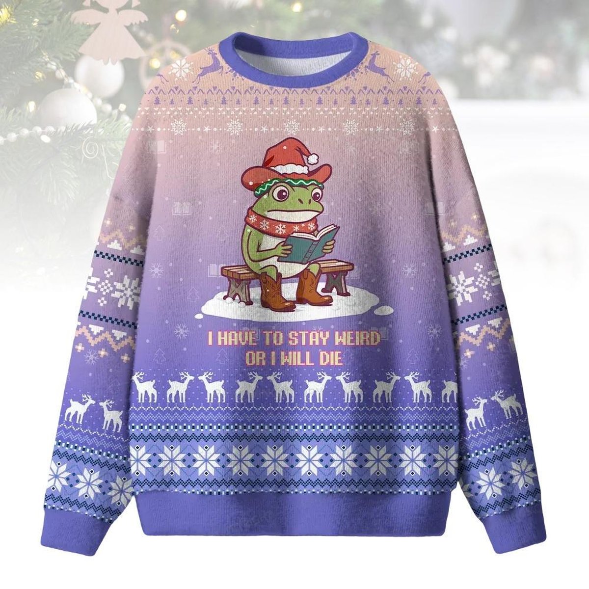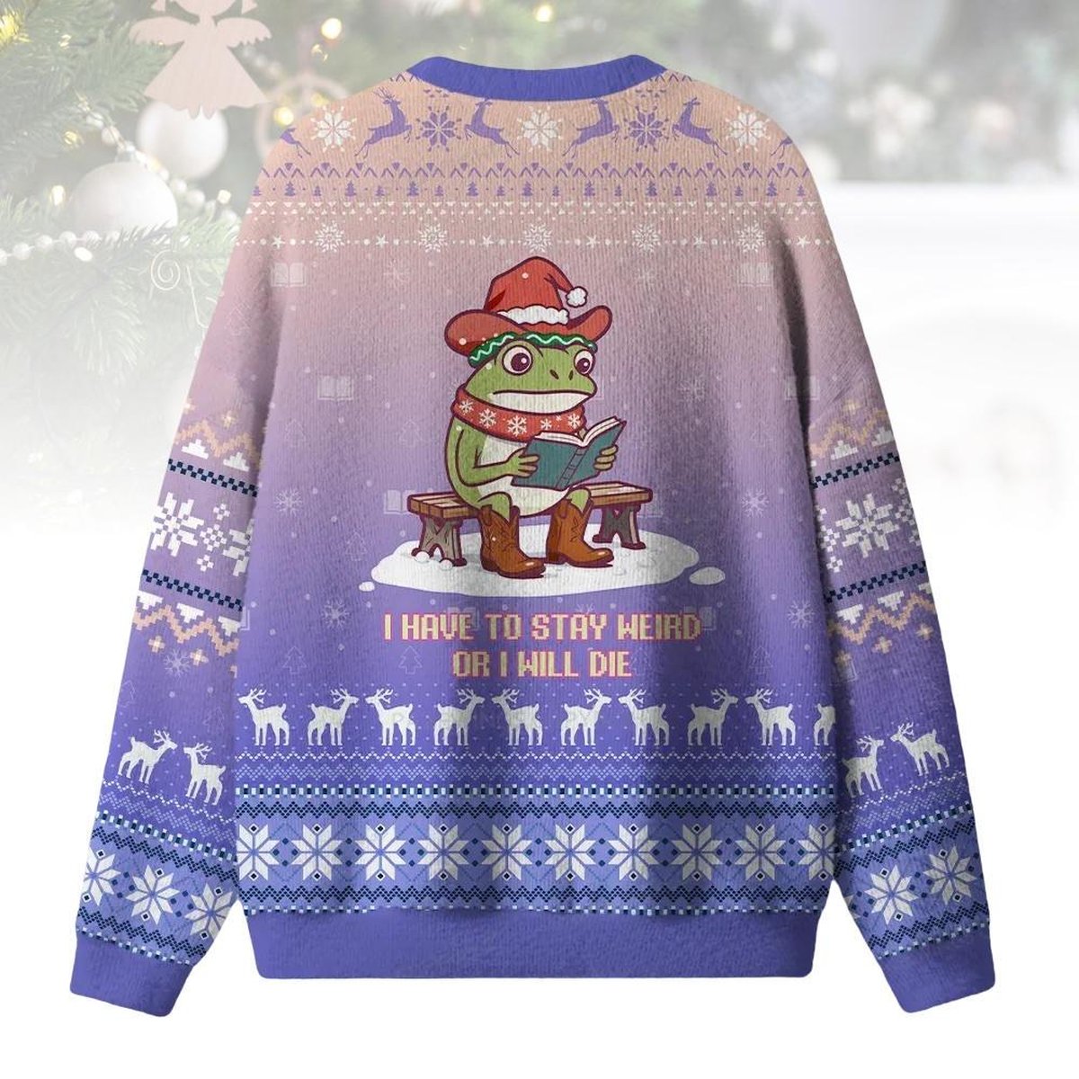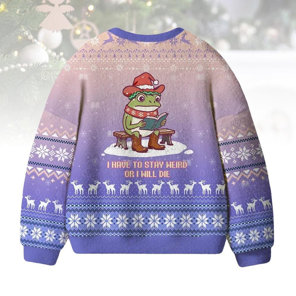 Frog Stay Weird Purple Ugly Christmas Sweater Whimsical Funny Quote Holiday Knit Jumper