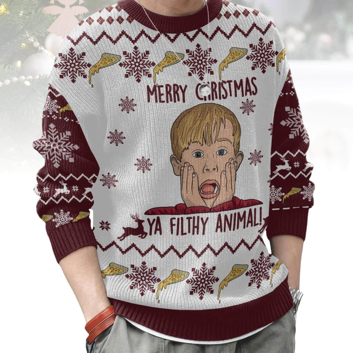 Home Alone Ya Filthy Animal Burgundy Ugly Christmas Sweater Funny Holiday Movie Knit Jumper