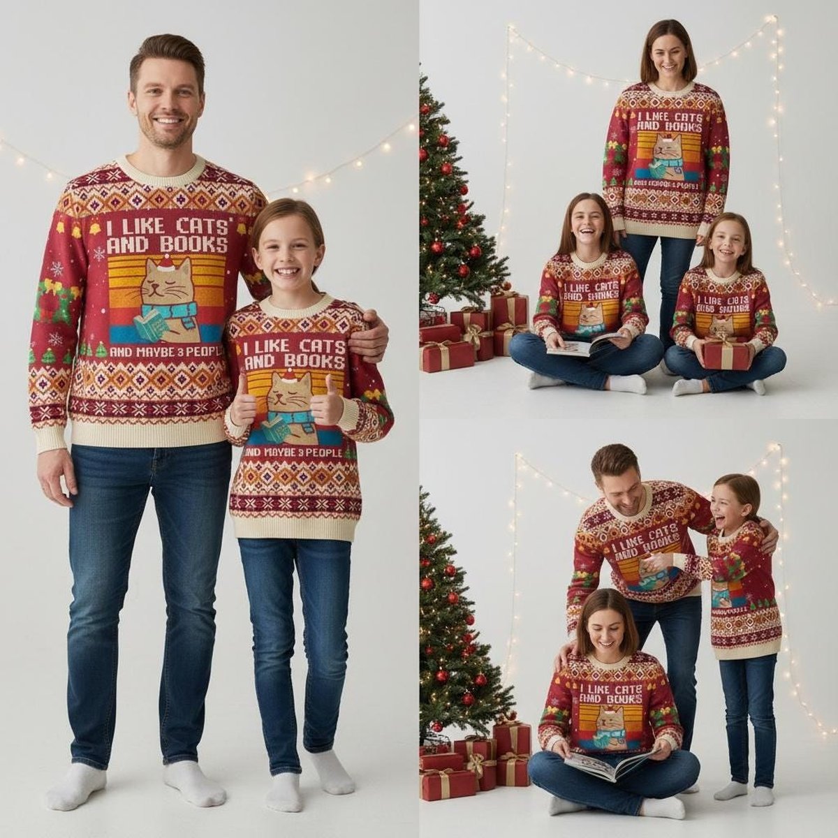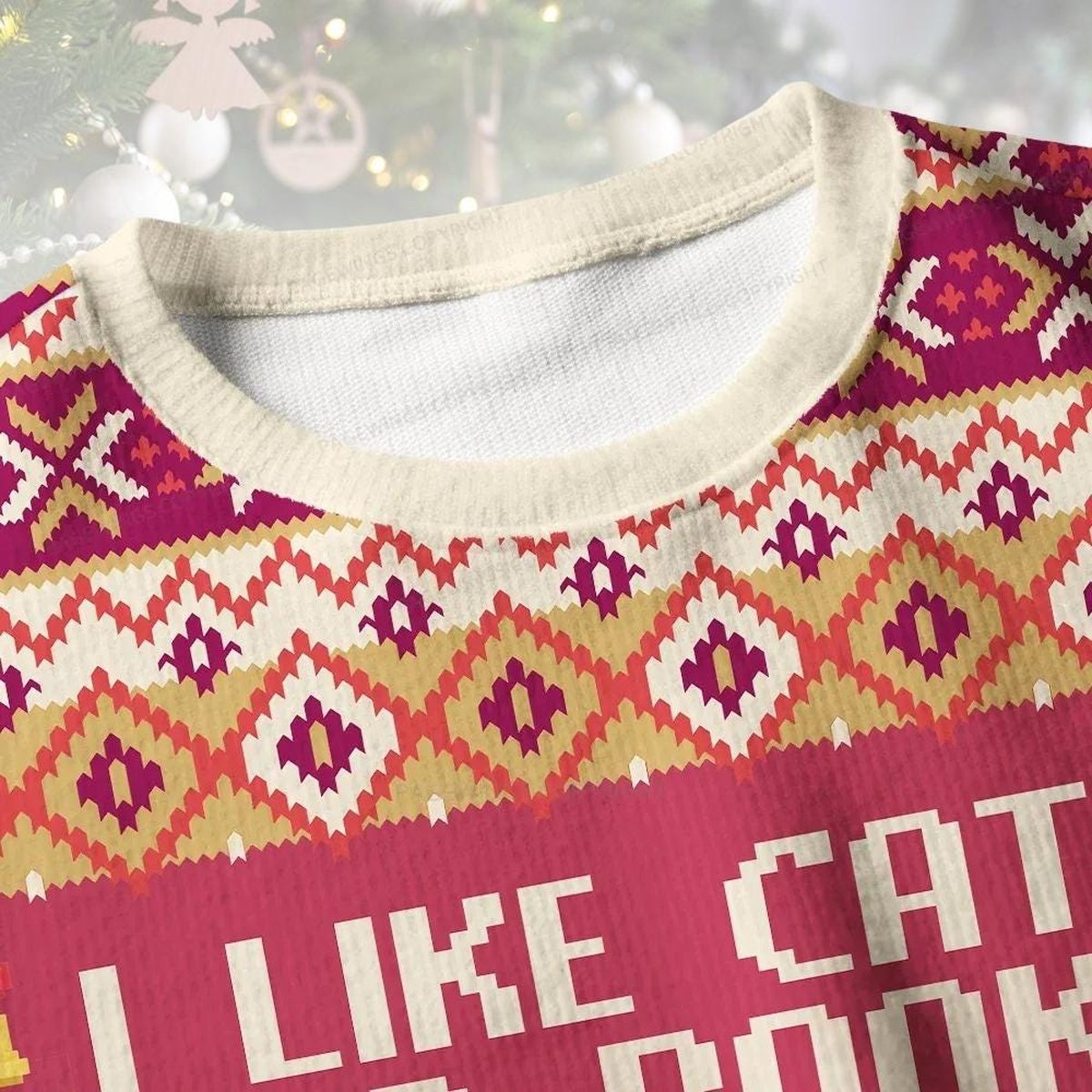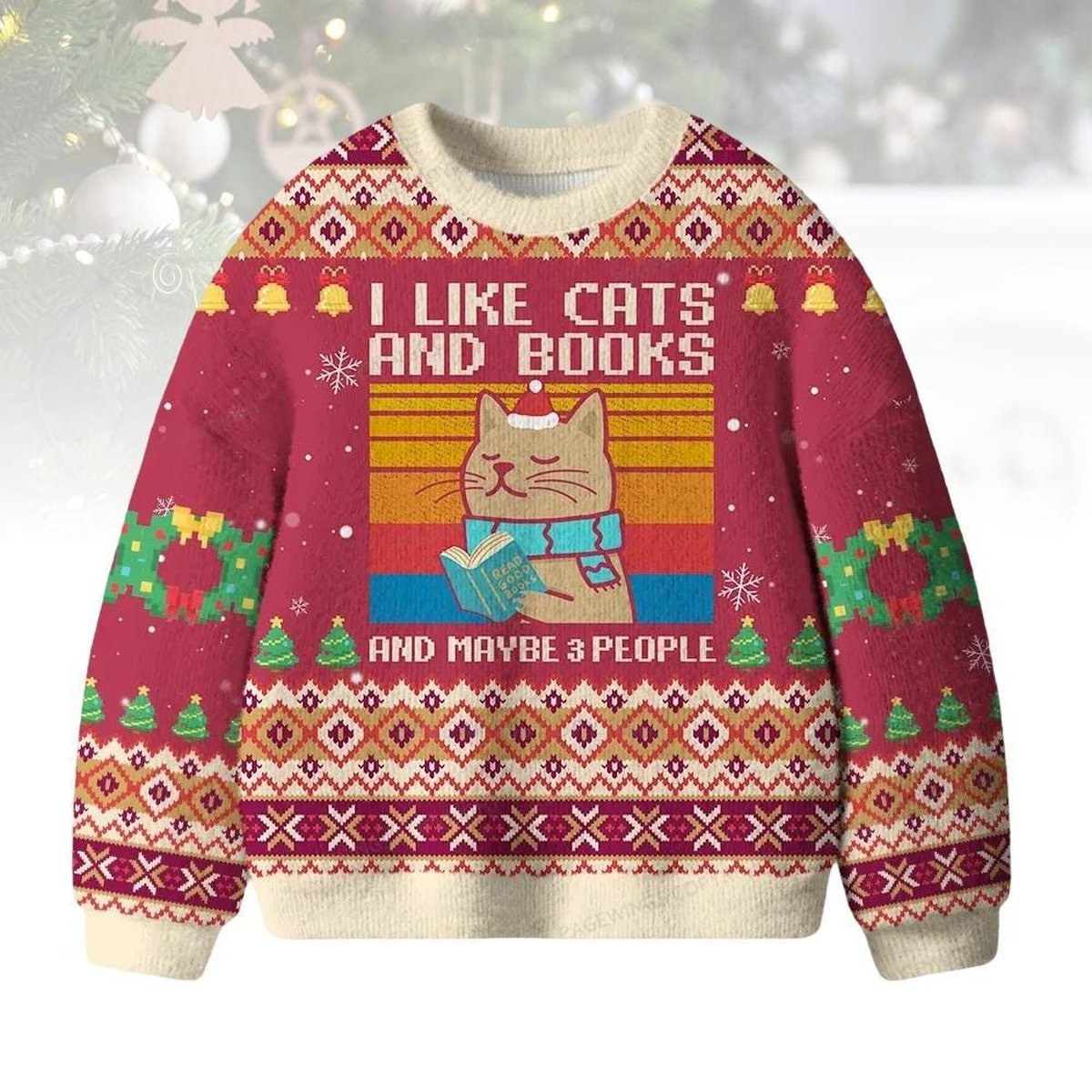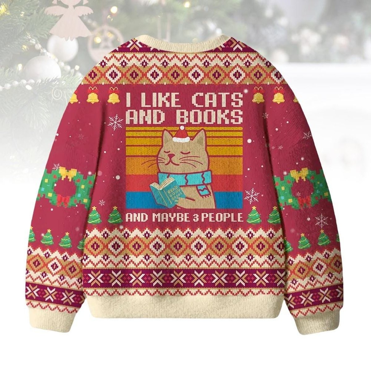 I Like Cats And Books And Maybe 3 People Ugly Christmas Sweater Funny Cat Lover Reading Gift