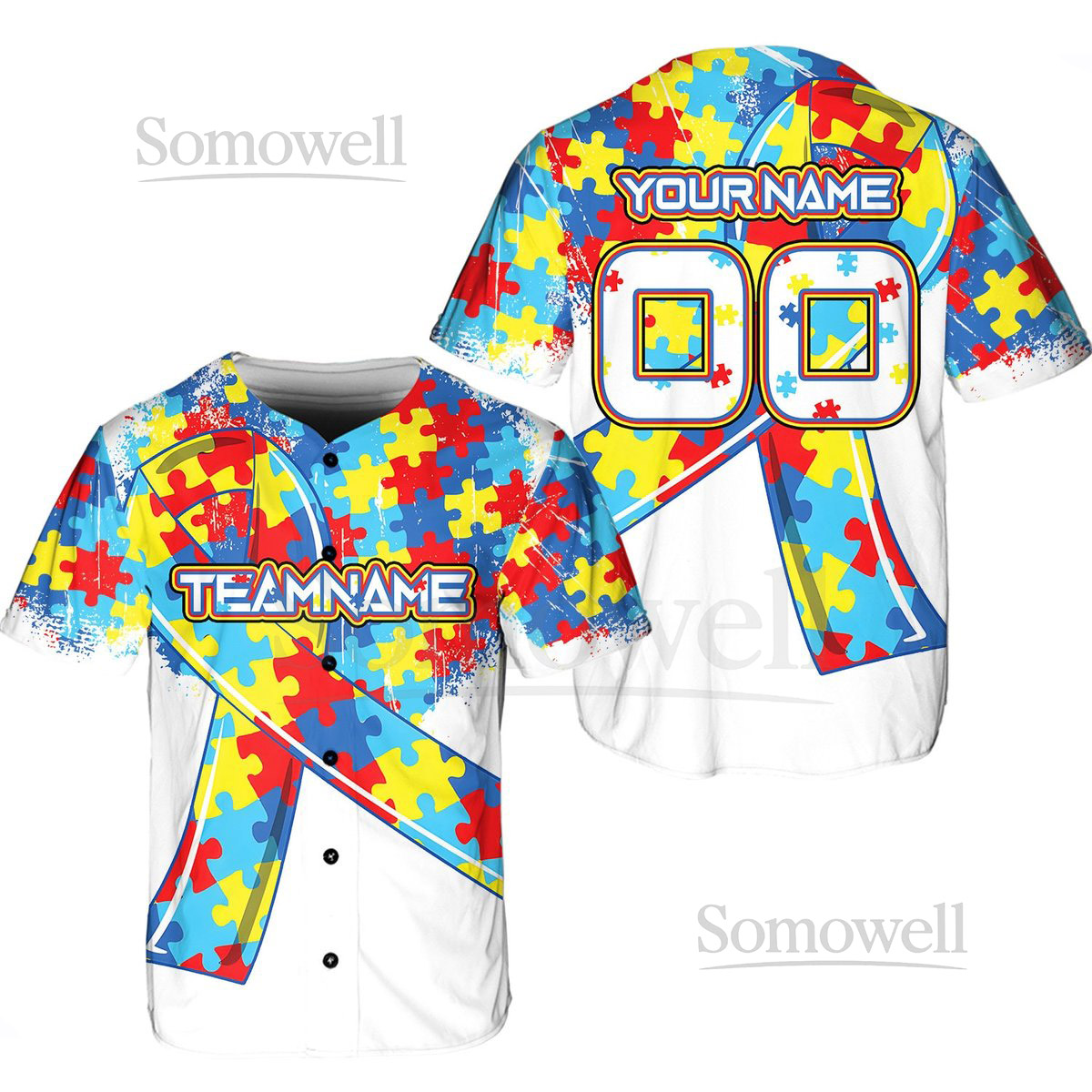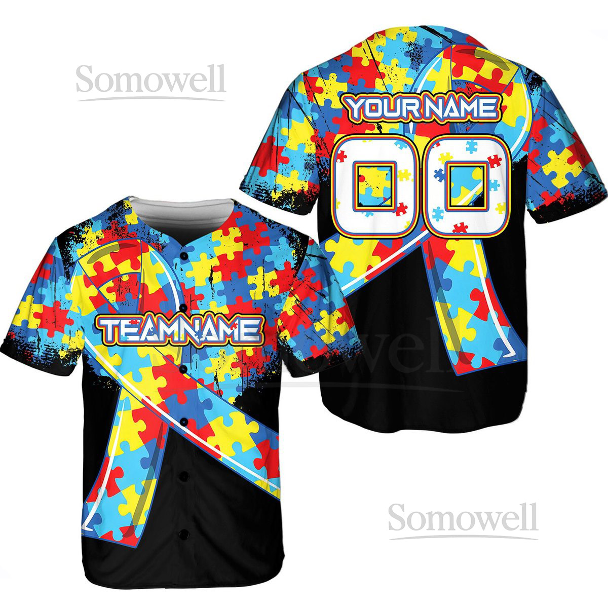 Personalized Autism Awareness Baseball Jersey Custom Name Puzzle Autism Baseball Jersey Autism Support Baseball Autism Ribbon Jersey_012