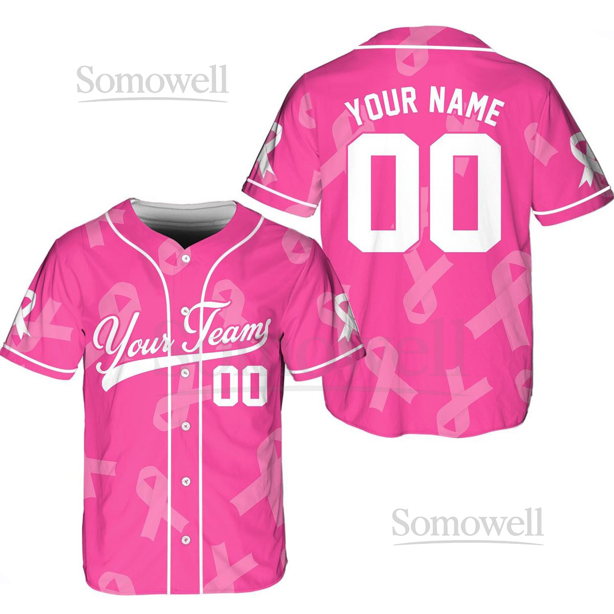 Personalized Breast Cancer Team Name And Number Baseball Jersey Custom Pink Ribbon Baseball Jersey Shirt Breast Cancer Warrior Jersey_044