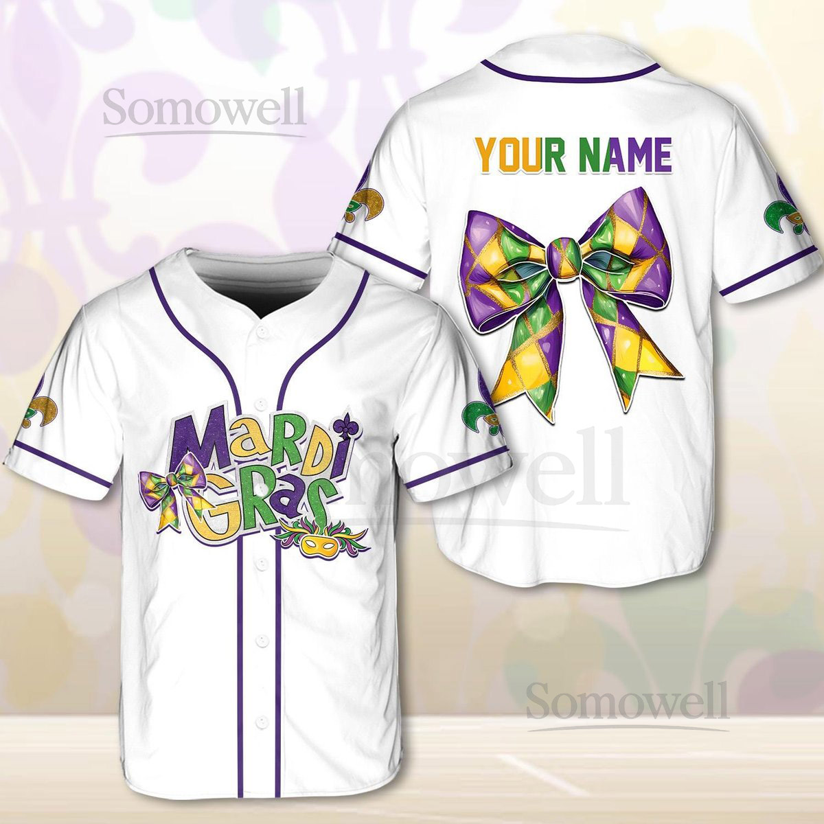 Personalized Mardi Gras Baseball Jersey Men Women Kid Youth Custom Mardi Gras With Bow Ribbon Baseball Jersey Perfect For Carnival_259