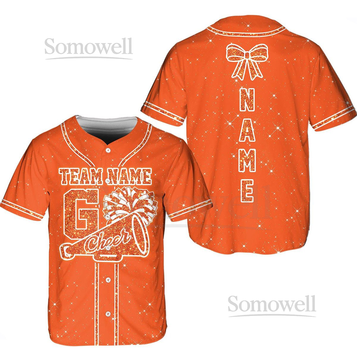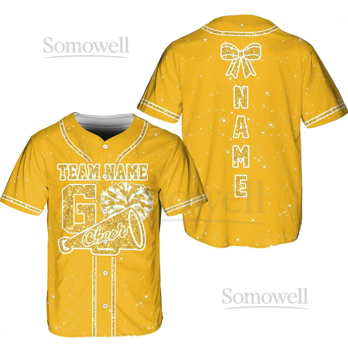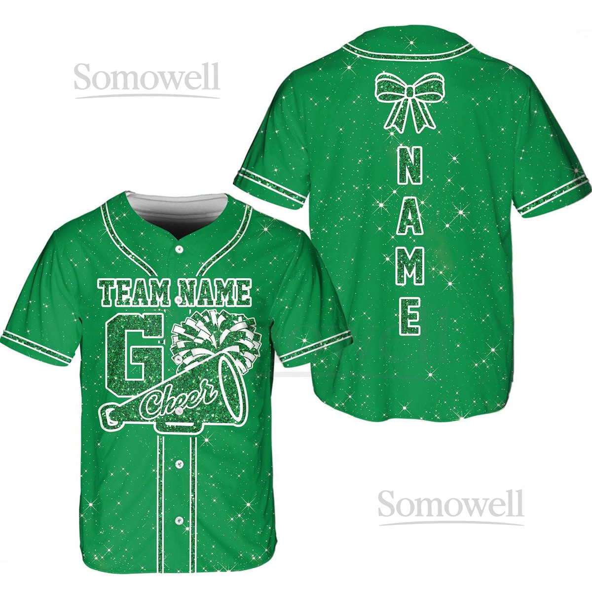 Personalized Team Name Number Bow Megaphone Baseball Jersey Sparkle Glitter Team Uniform Cheer Shirt for Adult Kid Youth Cheerleading_729