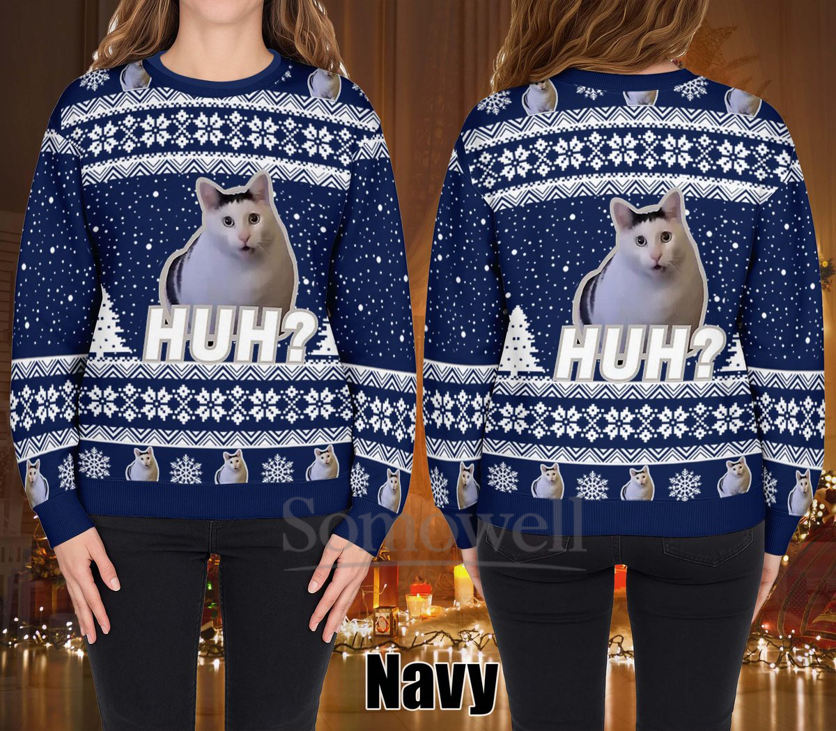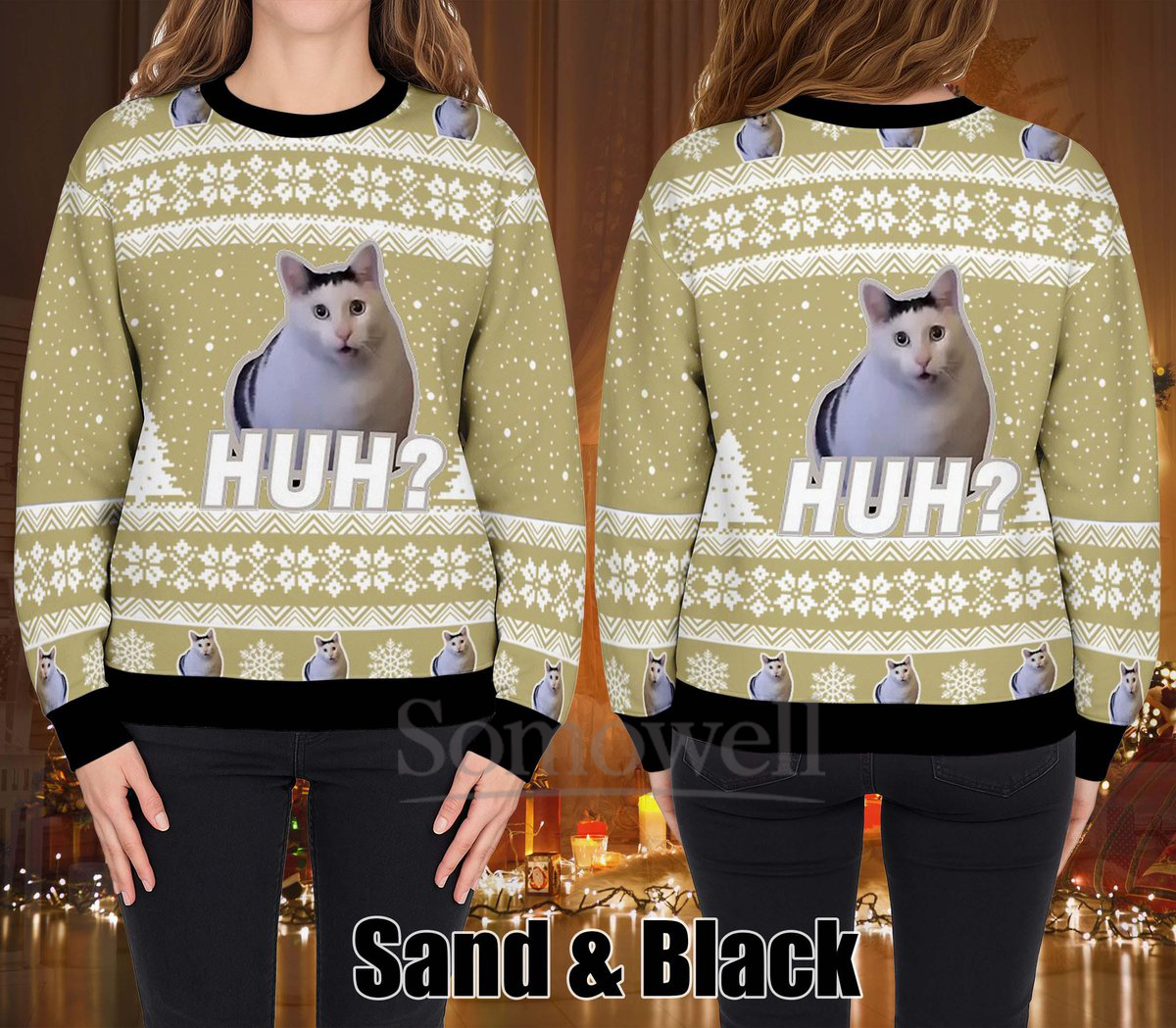 Huh Cat Meme Ugly Christmas Sweater Funny Red Holiday Knit Jumper Gift for Cat Lovers