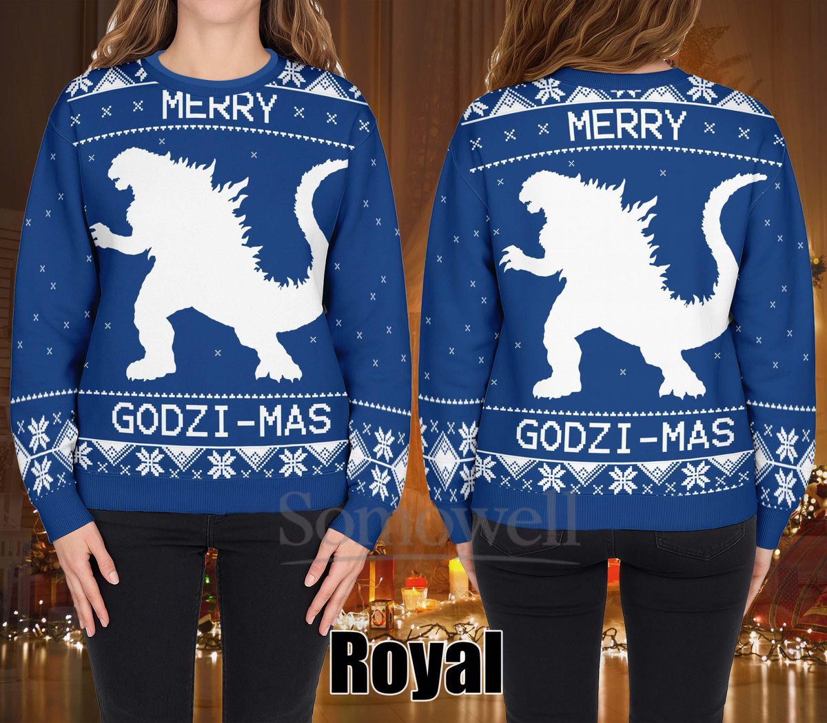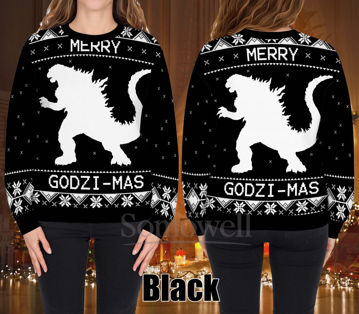 Merry Godzi-Mas Ugly Christmas Sweater Funny Monster Movie Black Red Holiday Knit Jumper