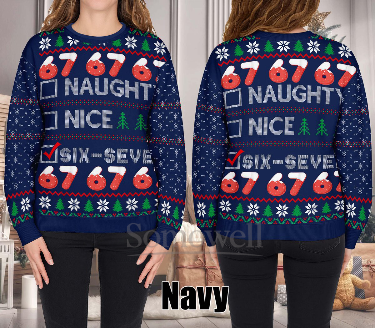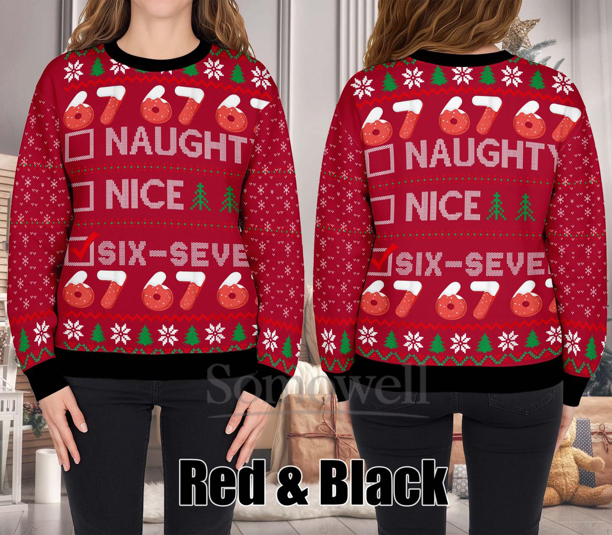 Six Seven Naughty Nice List Ugly Christmas Sweater Funny Black Red Holiday Knit Jumper