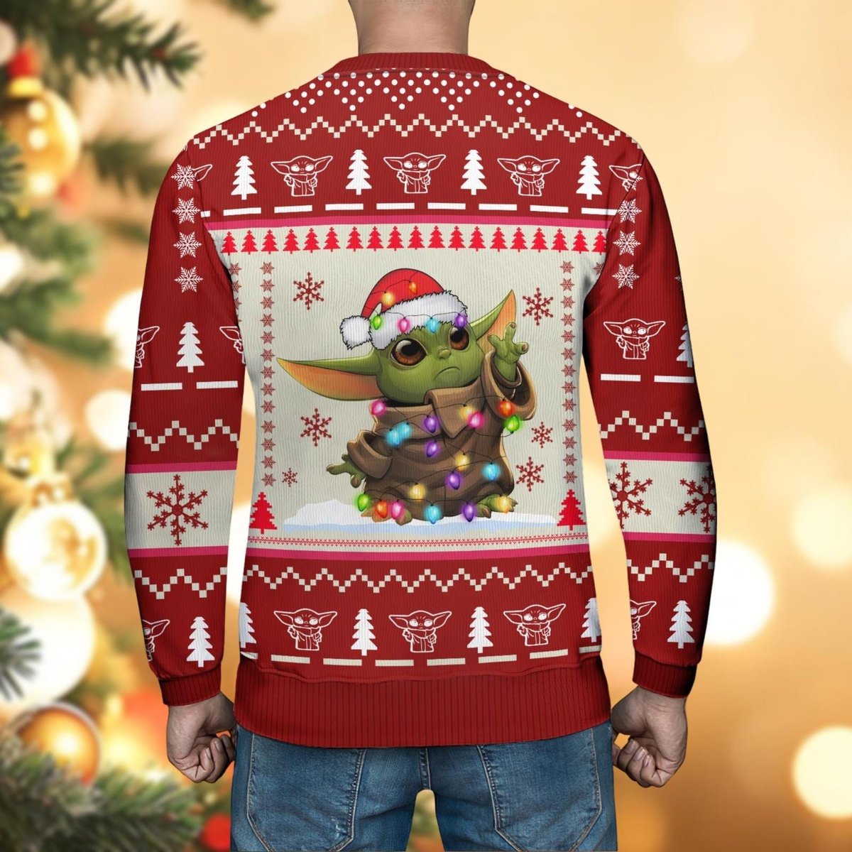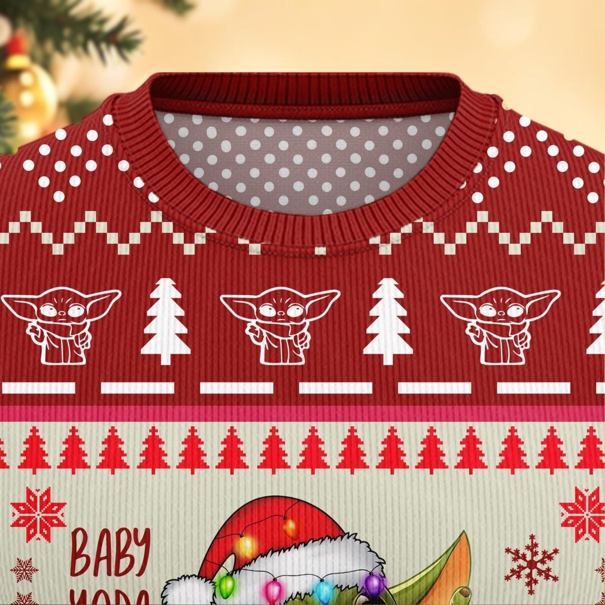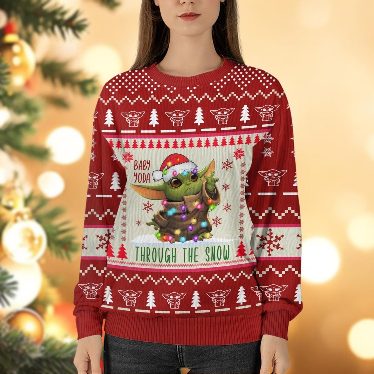 Baby Yoda Through the Snow Red Ugly Christmas Sweater Funny Star Galactic Holiday Knit Jumper