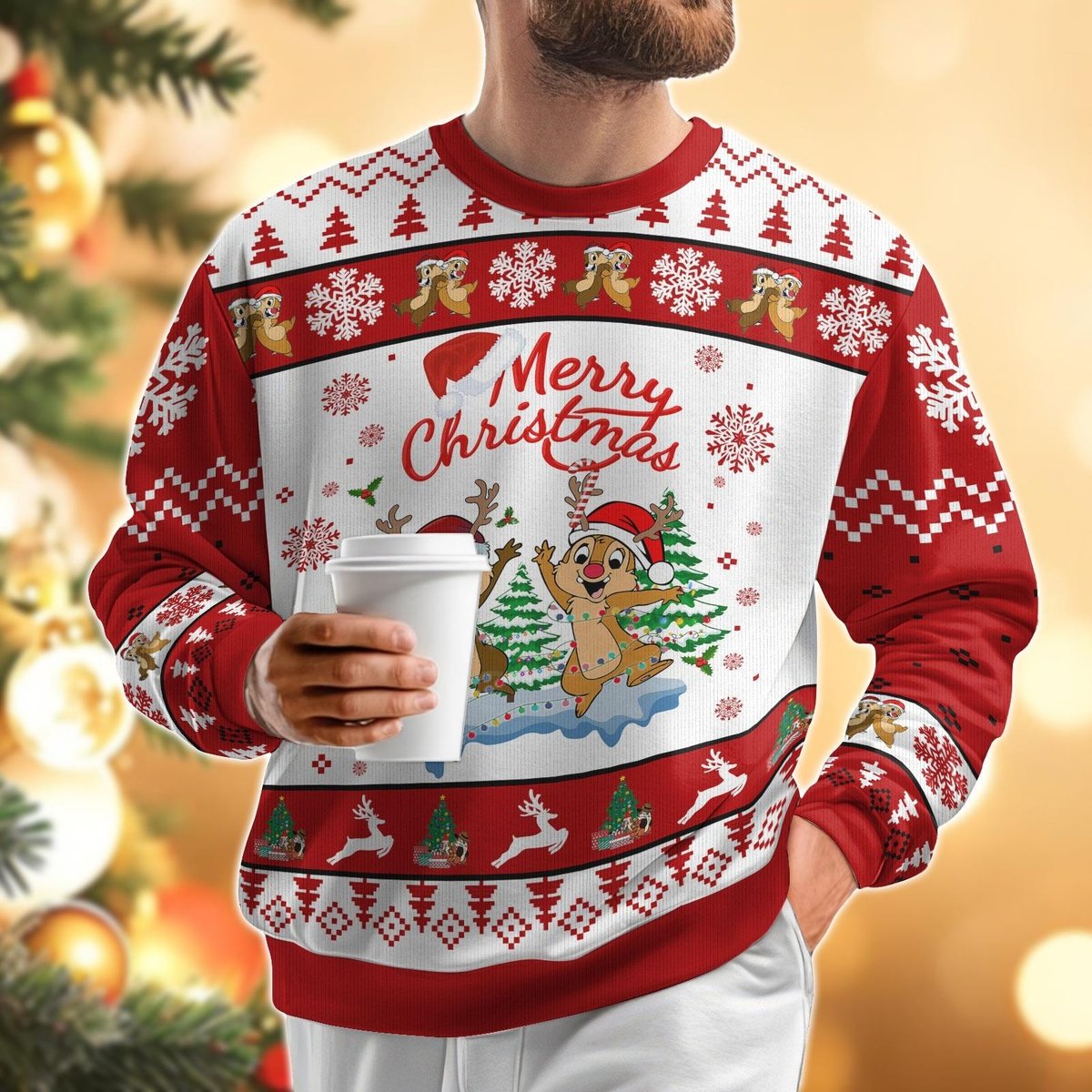 Chip and Dale Merry Christmas Ugly Sweater, Red White Festive Holiday Knit Jumper