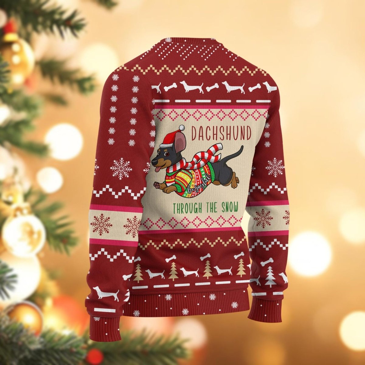 Dachshund Through The Snow Red Ugly Christmas Sweater Funny Dog Lovers Holiday Knit Jumper