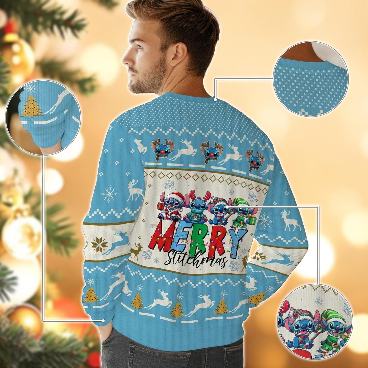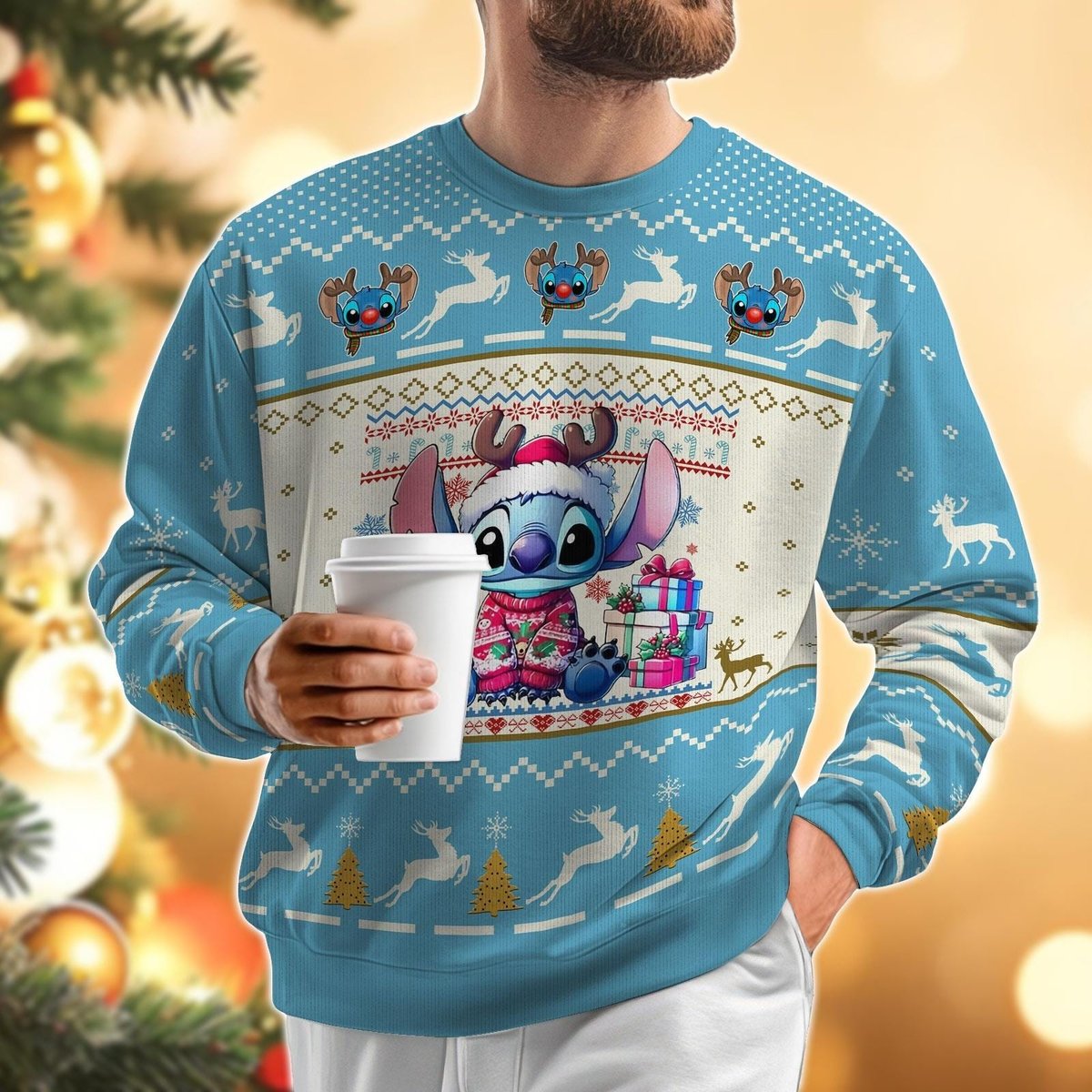Disney Stitch Blue Reindeer Ugly Christmas Sweater, Cute Winter Holiday Knit Jumper