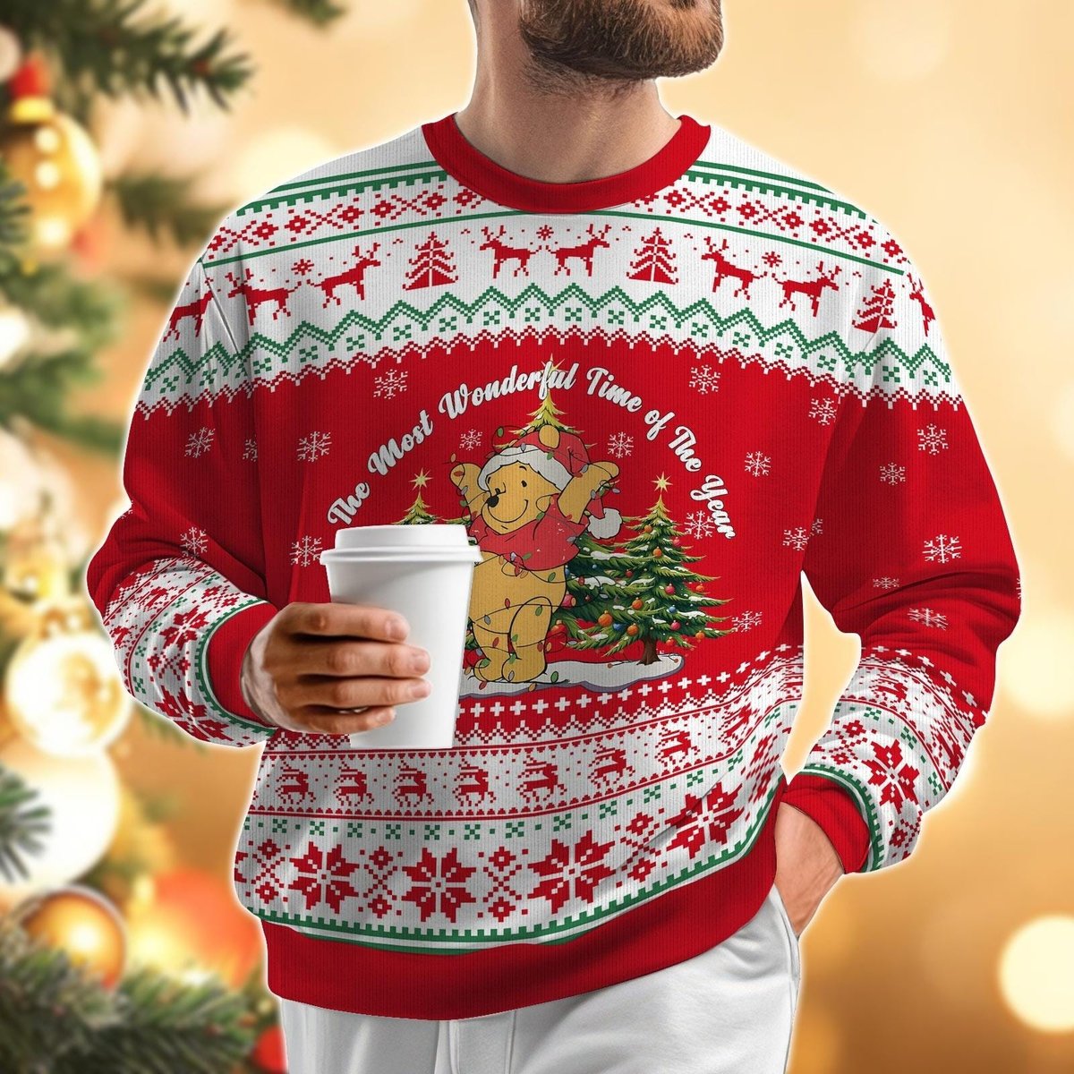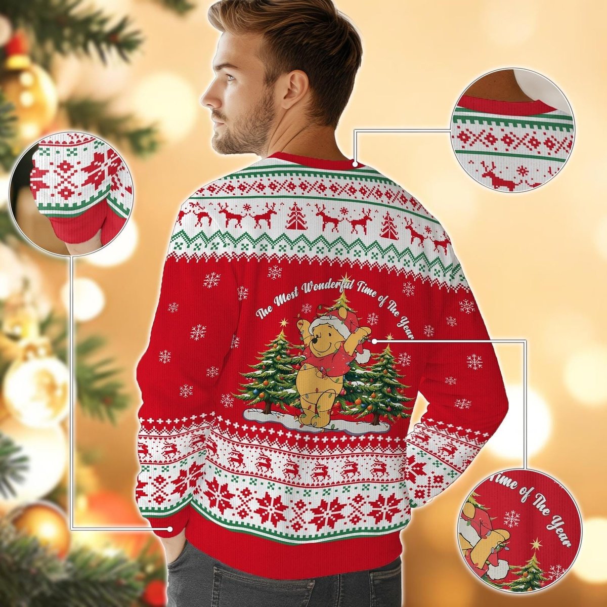 Pooh Bear Wonderful Time Red Ugly Christmas Sweater Cute Cartoon Holiday Knit Gift