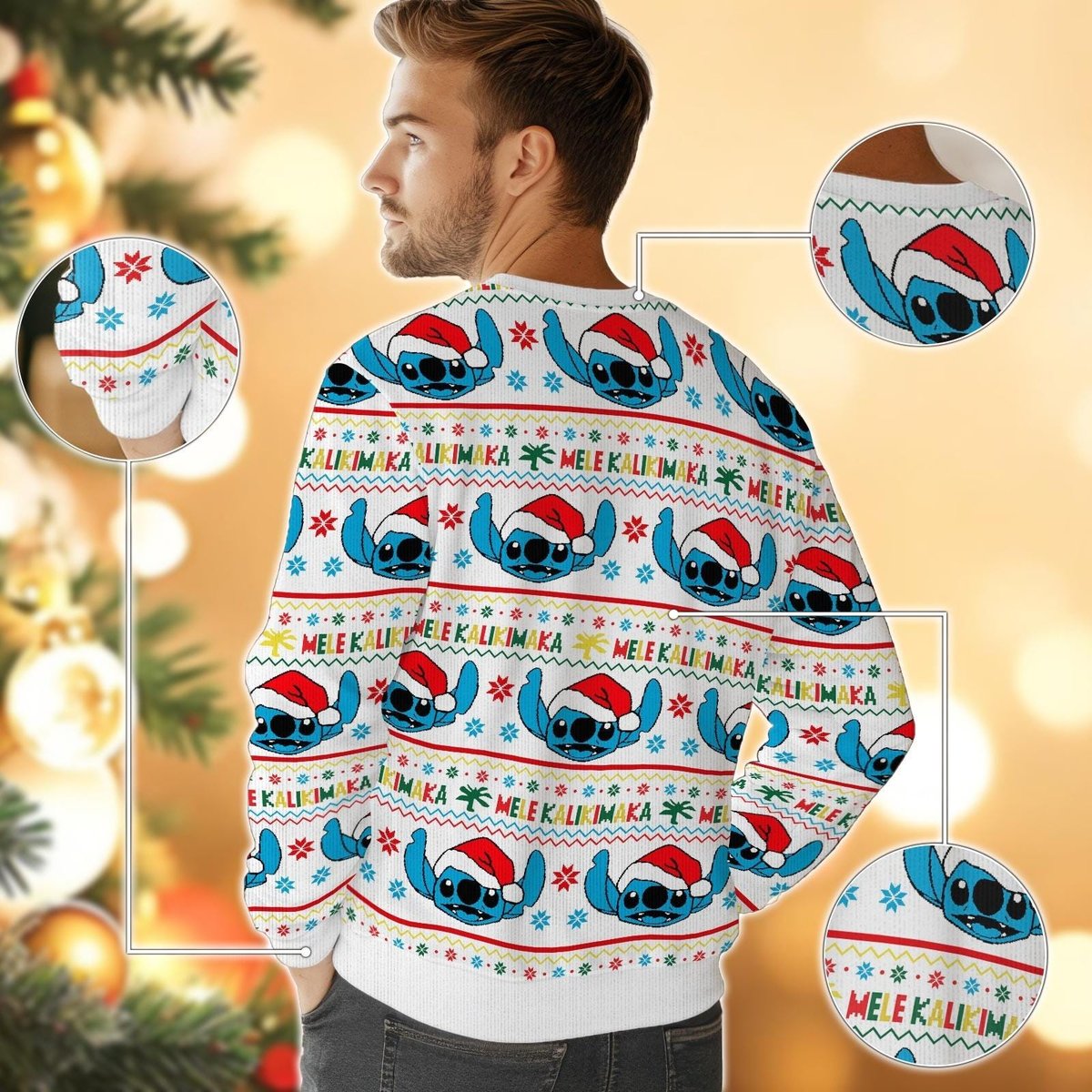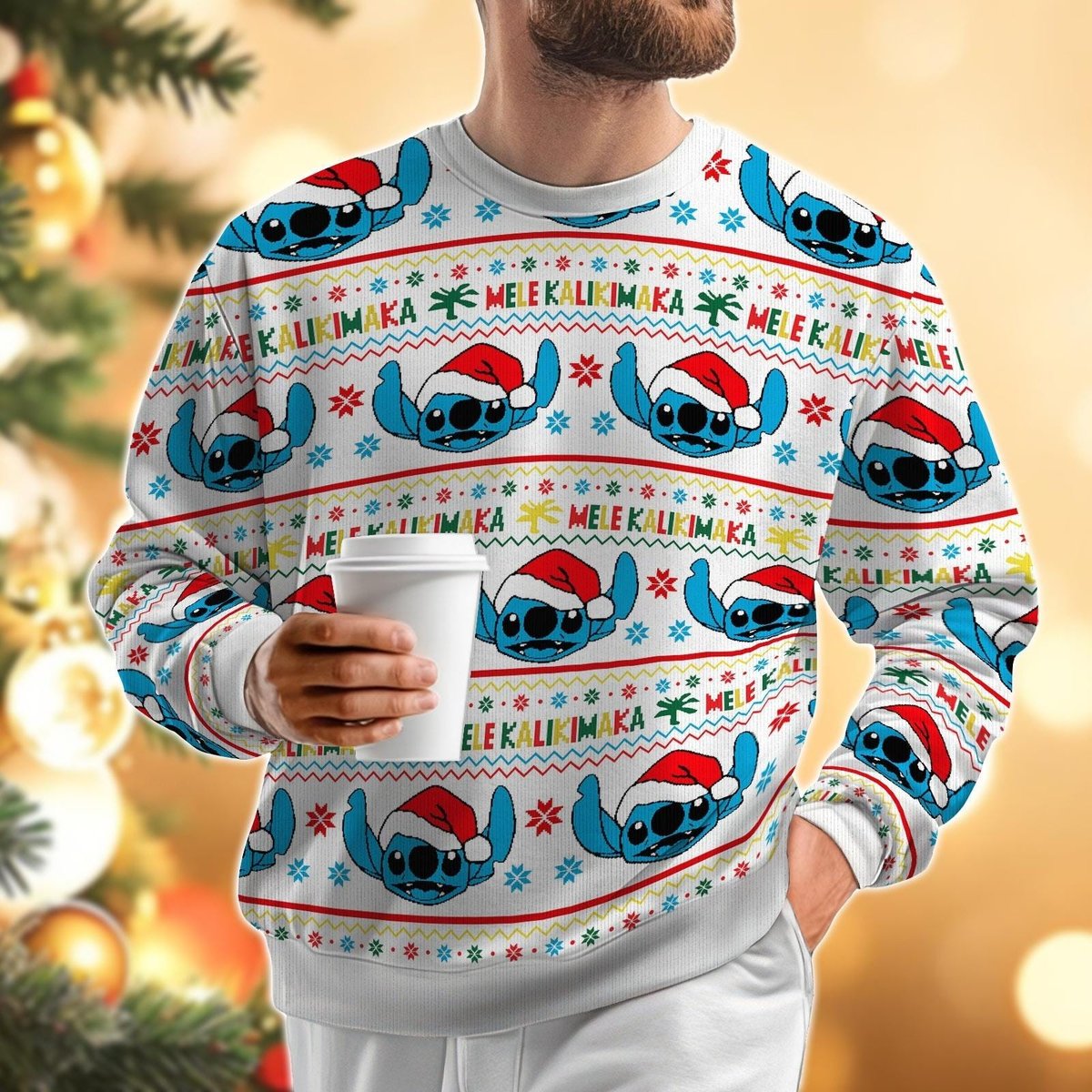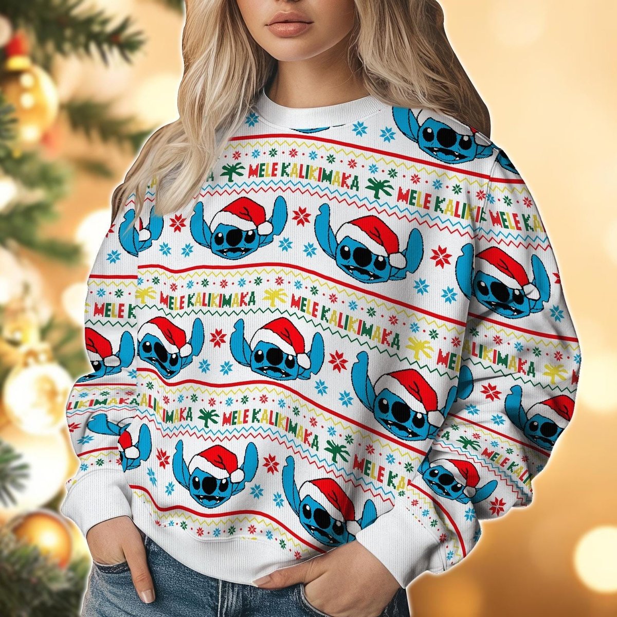 Stitch Mele Kalikimaka White Ugly Christmas Sweater Tropical Holiday Pullover