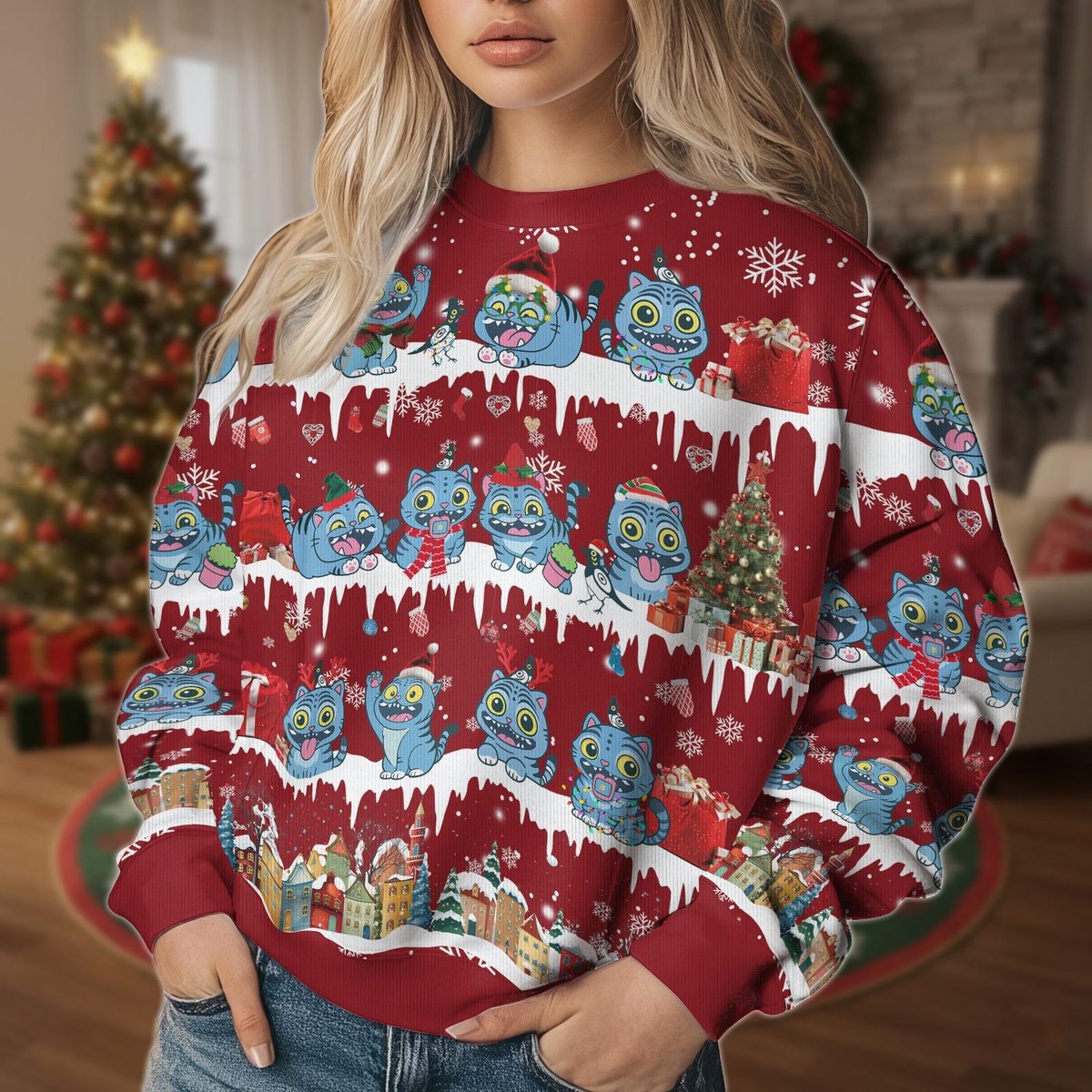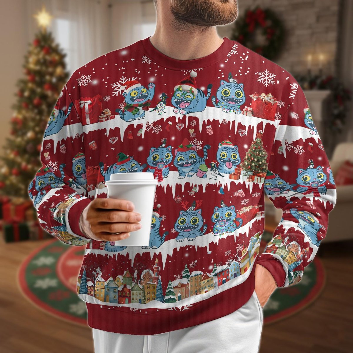 Chibi Derp Tiger Christmas Ugly Sweater Red Cute Cartoon Cat Holiday Knit Jumper