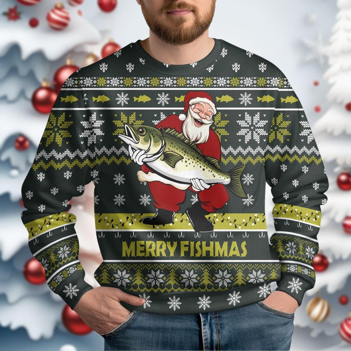 Merry Fishmas Green Christmas Ugly Sweater Funny Santa Fishing Holiday Knit Jumper
