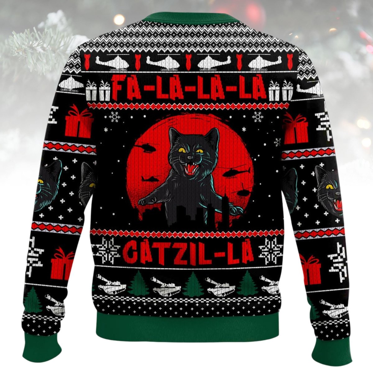 Black Cat Fa-La-La-La Gatzilla Funny Ugly Christmas Sweater Holiday Knit Gift