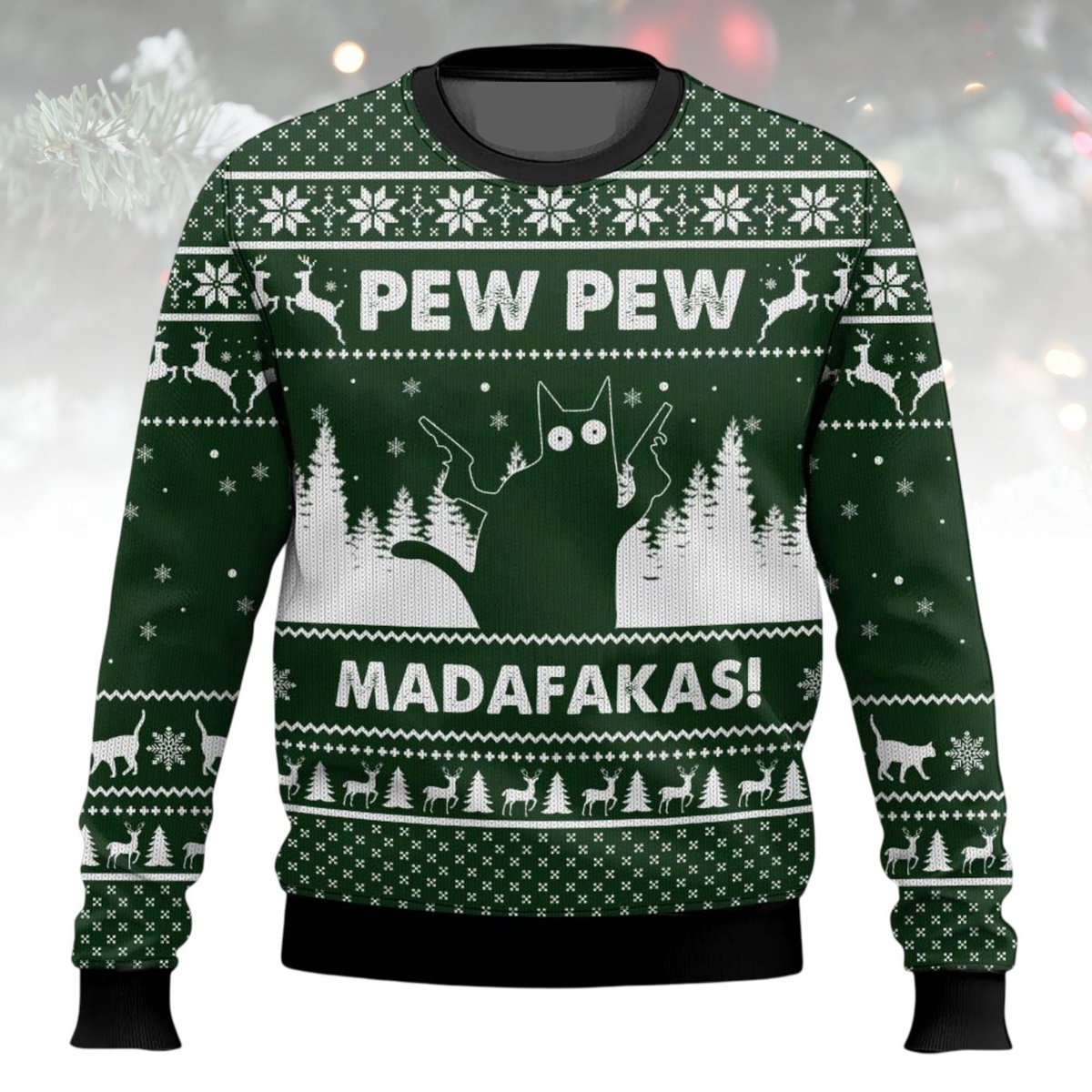 Cat Pew Pew Funny Green Ugly Christmas Sweater Holiday Knit Gift