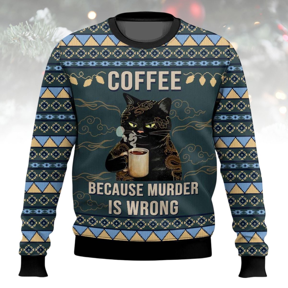 Coffee Because Murder Is Wrong Cat Ugly Christmas Sweater Funny Black Cat Holiday Knit Jumper