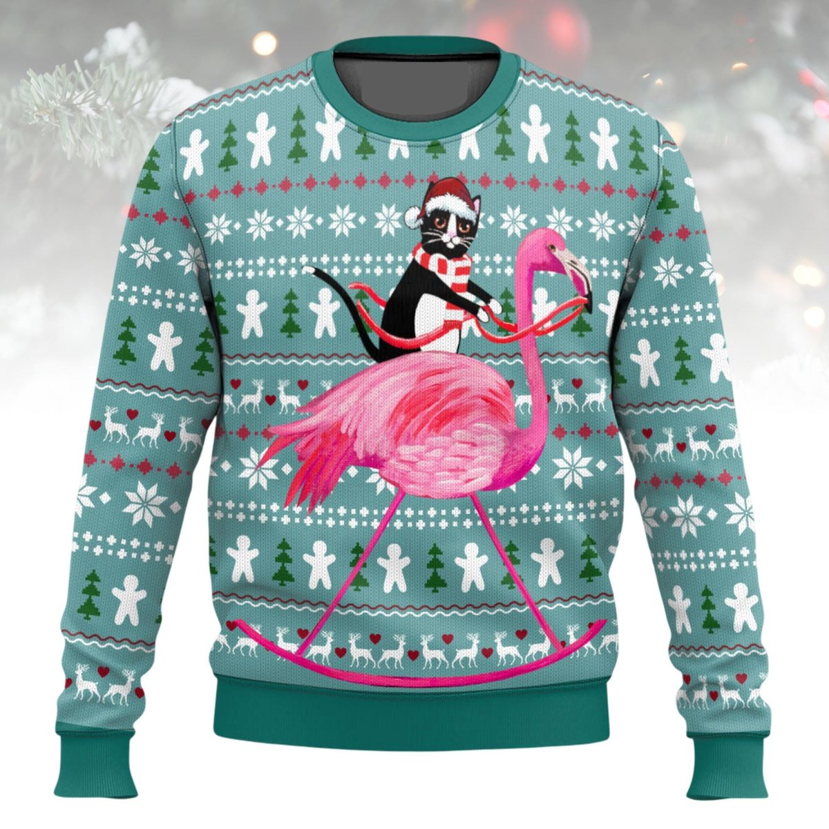 Flamingo Cat Funny Light Blue Ugly Christmas Sweater Holiday Knit Gift