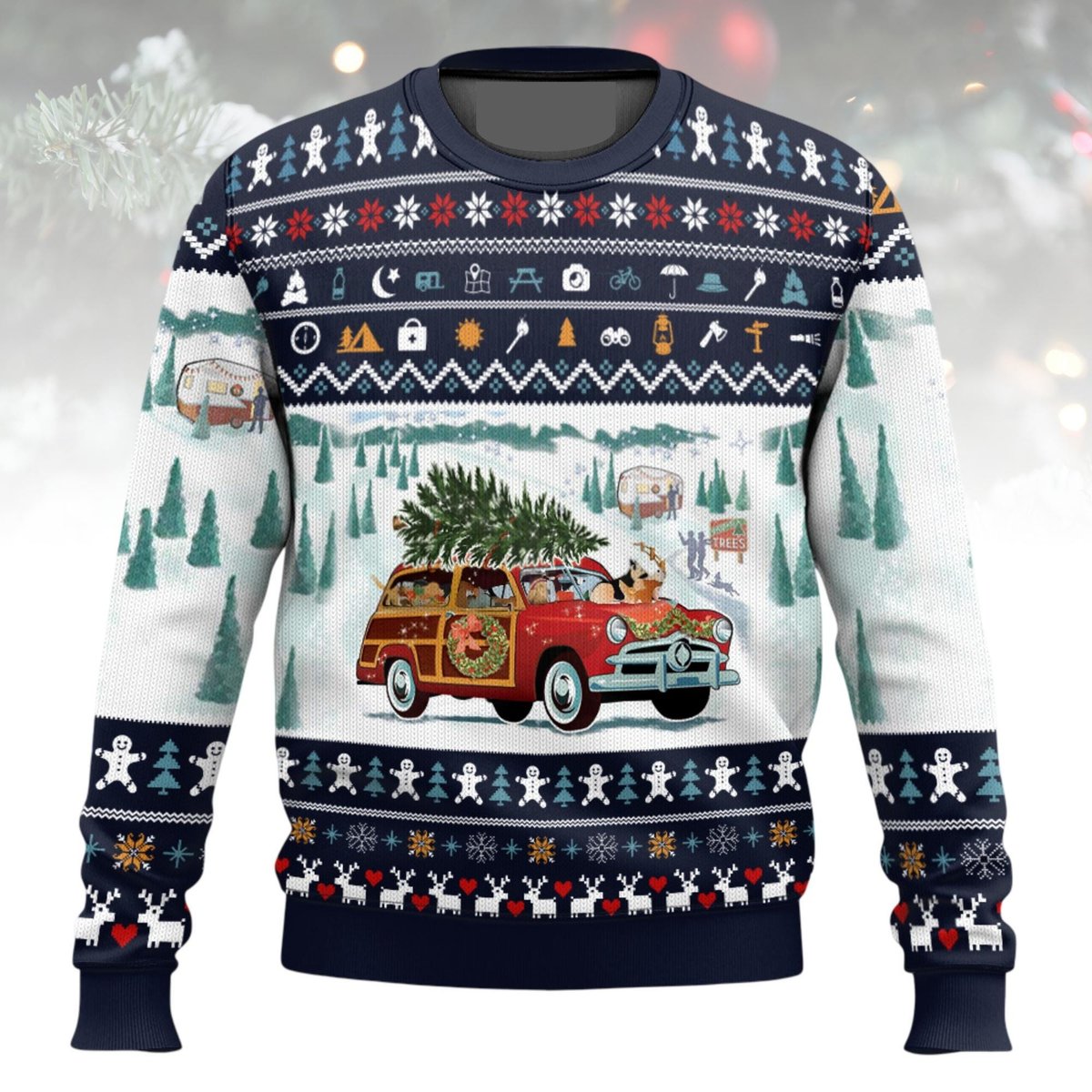 Funny Dog In Car Christmas Road Trip Blue Ugly Sweater Holiday Knit Gift