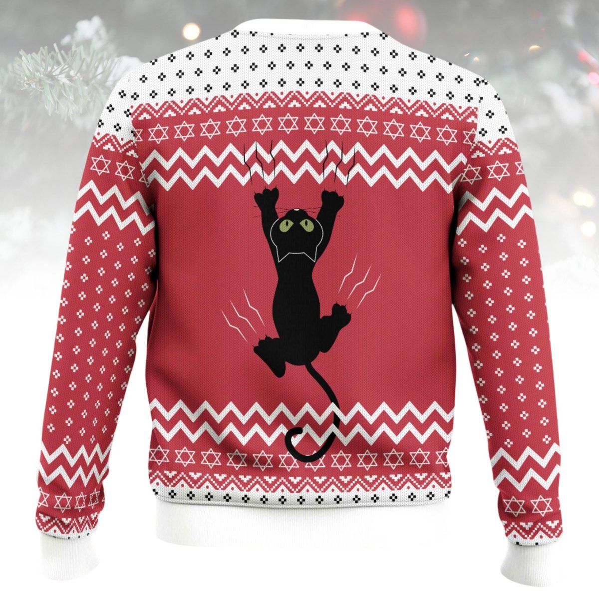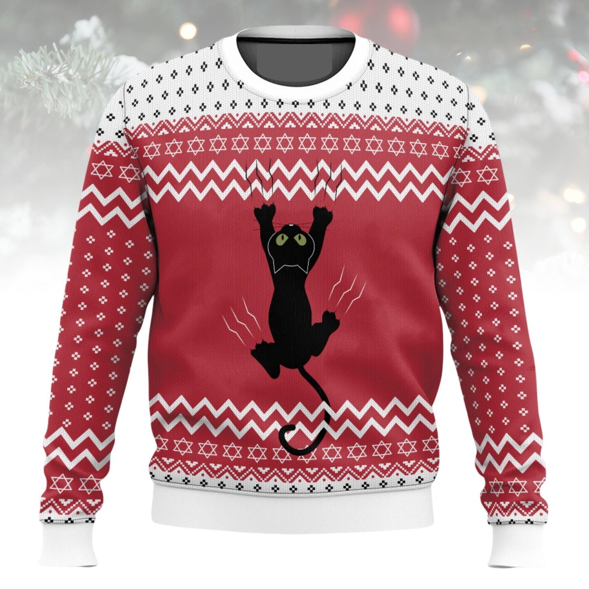 Funny Black Cat Climbing Red Ugly Christmas Sweater Holiday Knit Gift