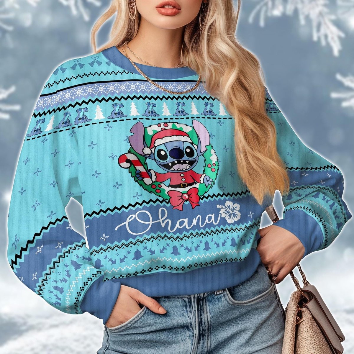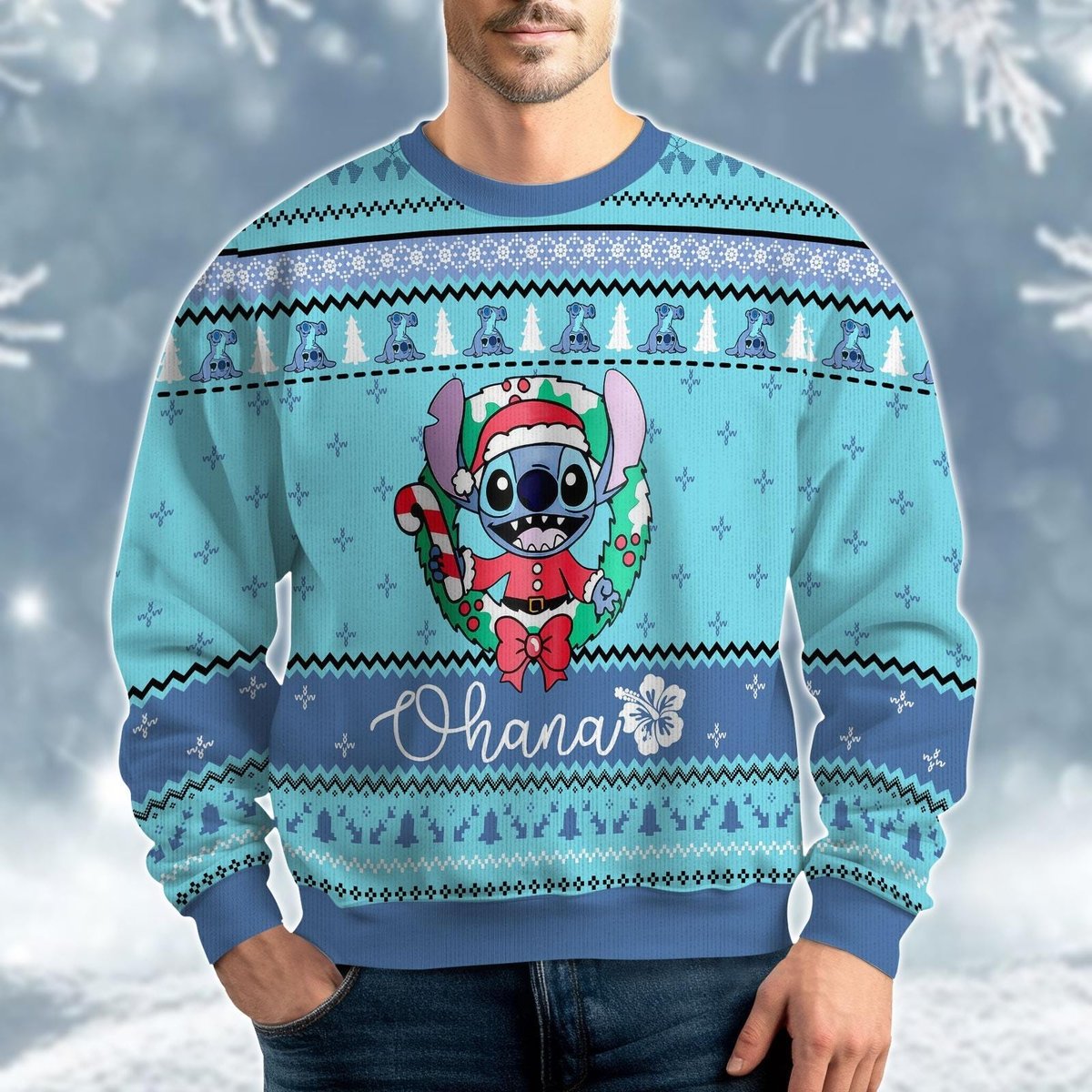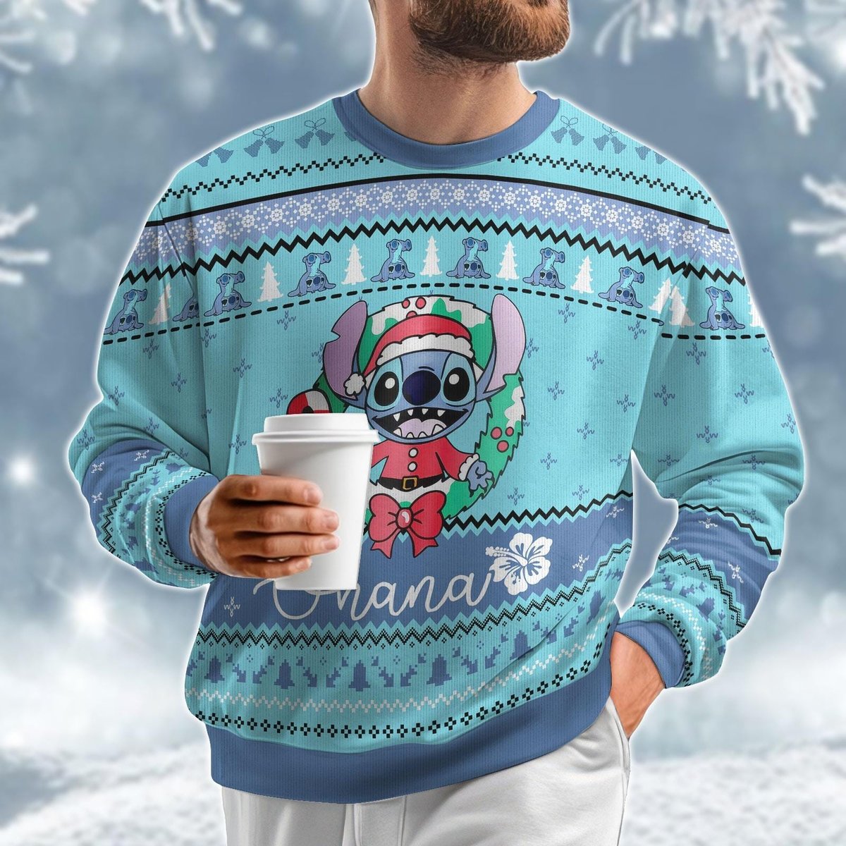 Lilo And Stitch Blue Christmas Ugly Sweater Ohana Santa Hat Holiday Knit Jumper