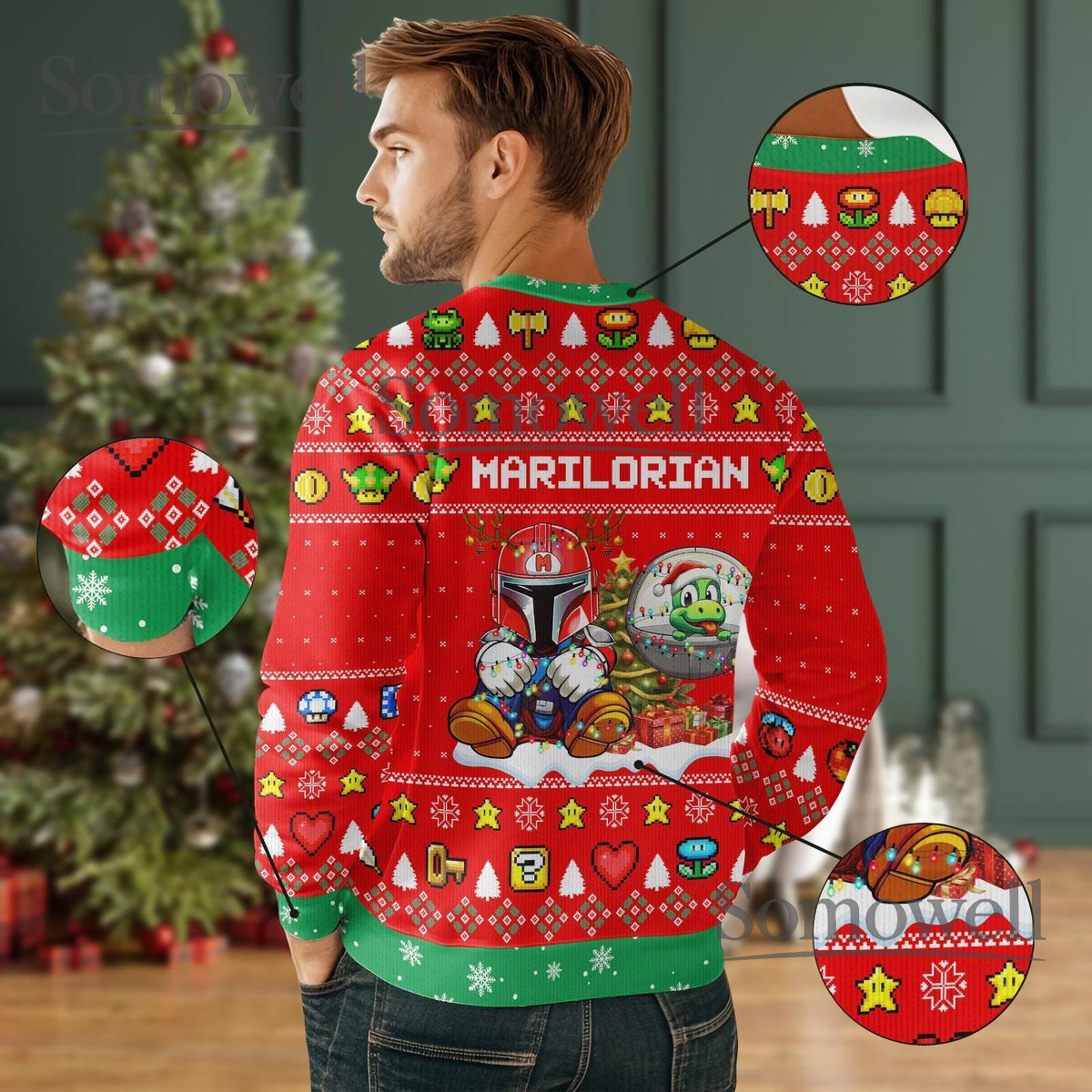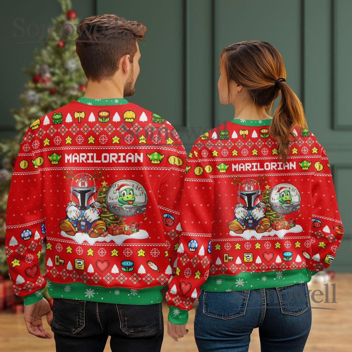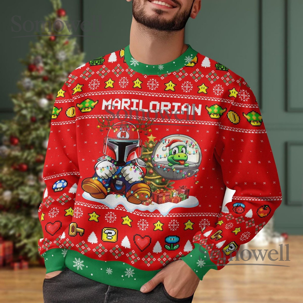 Marilorian Red Ugly Christmas Sweater Funny Gamer Mashup Holiday Knit Gift