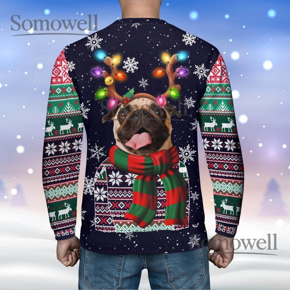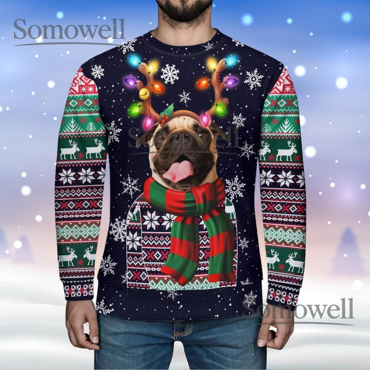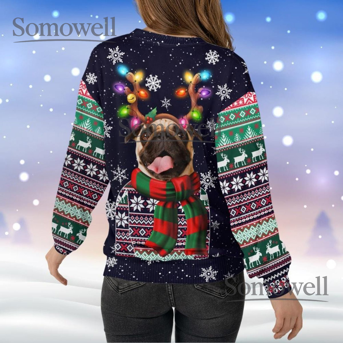 Pug Reindeer Navy Ugly Christmas Sweater Funny Dog Lover Holiday Knit Jumper