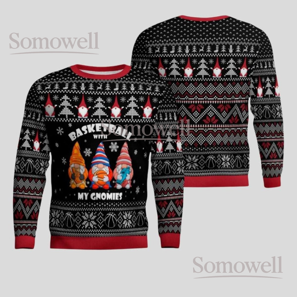 Basketball With My Gnomies Black Christmas Ugly Sweater Funny Sports Holiday Knit Jumper