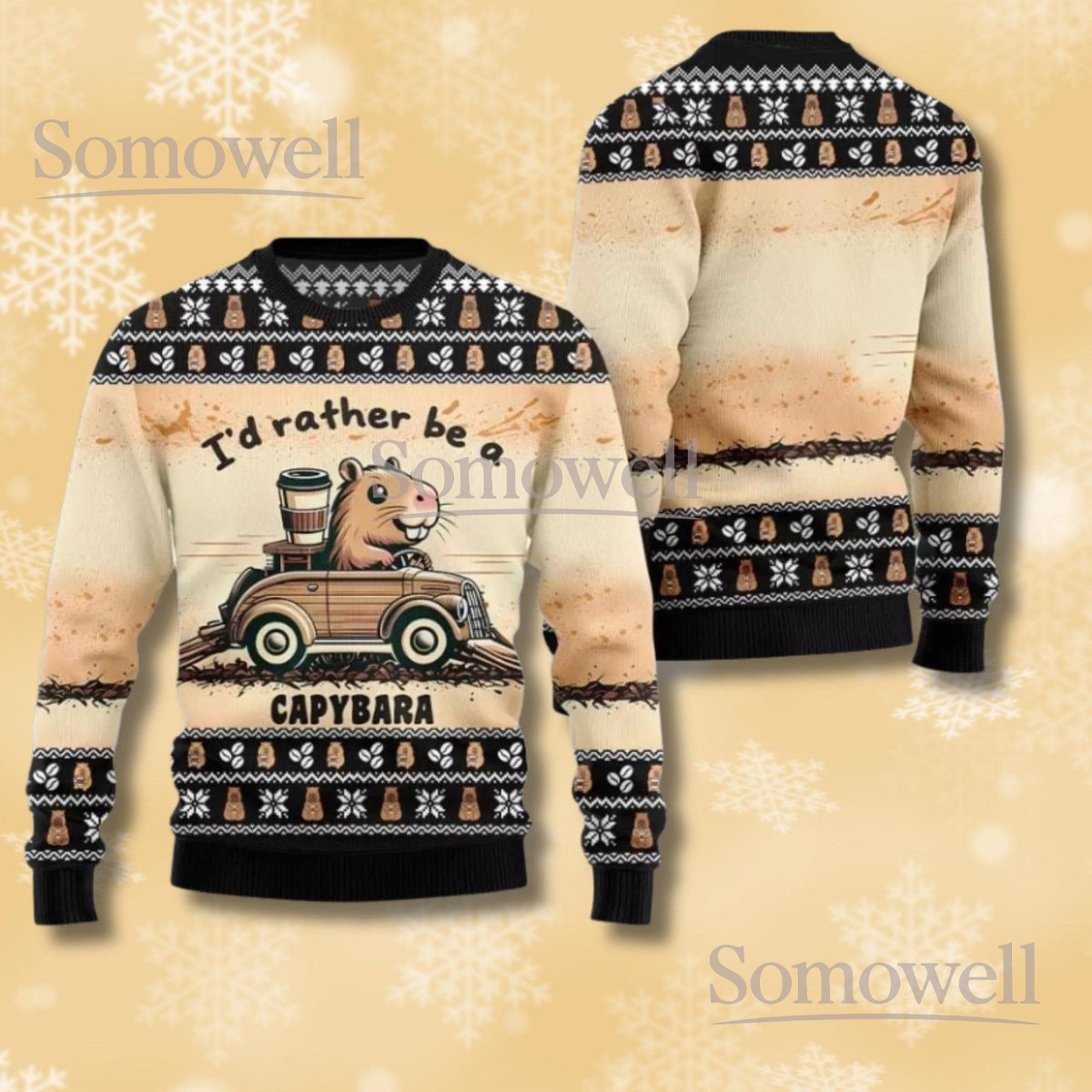 Capybara Christmas Beige Ugly Sweater Vintage Car Graphic Funny Holiday Knit Jumper