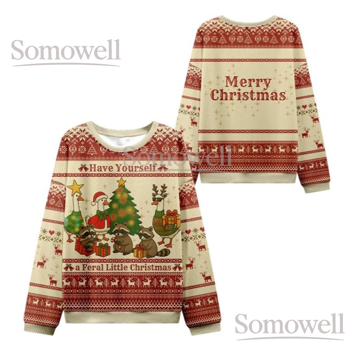 Feral Animals Tree Christmas Cream Ugly Sweater Cute Holiday Knit Jumper