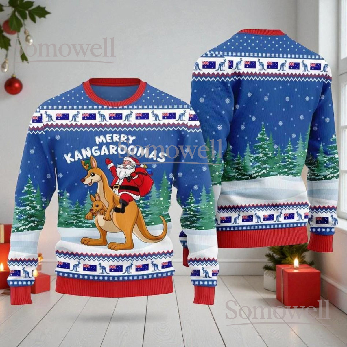 Kangaroo Santa Christmas Blue Ugly Sweater Funny Holiday Knit Jumper
