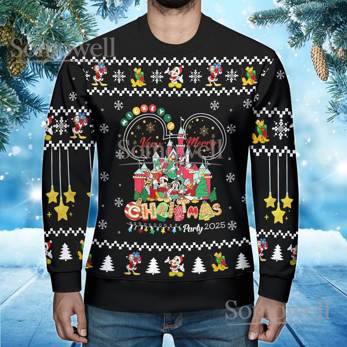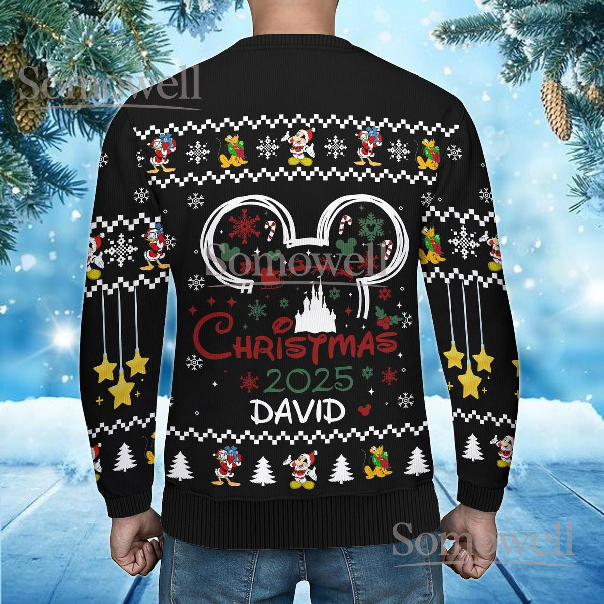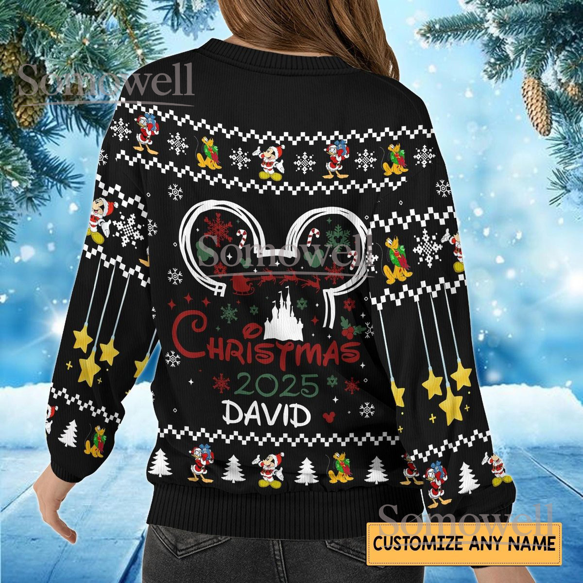 Mickey Friends Very Merry Christmas Black Ugly Sweater Disney Castle Party 2025 Custom Name Knit Jumper