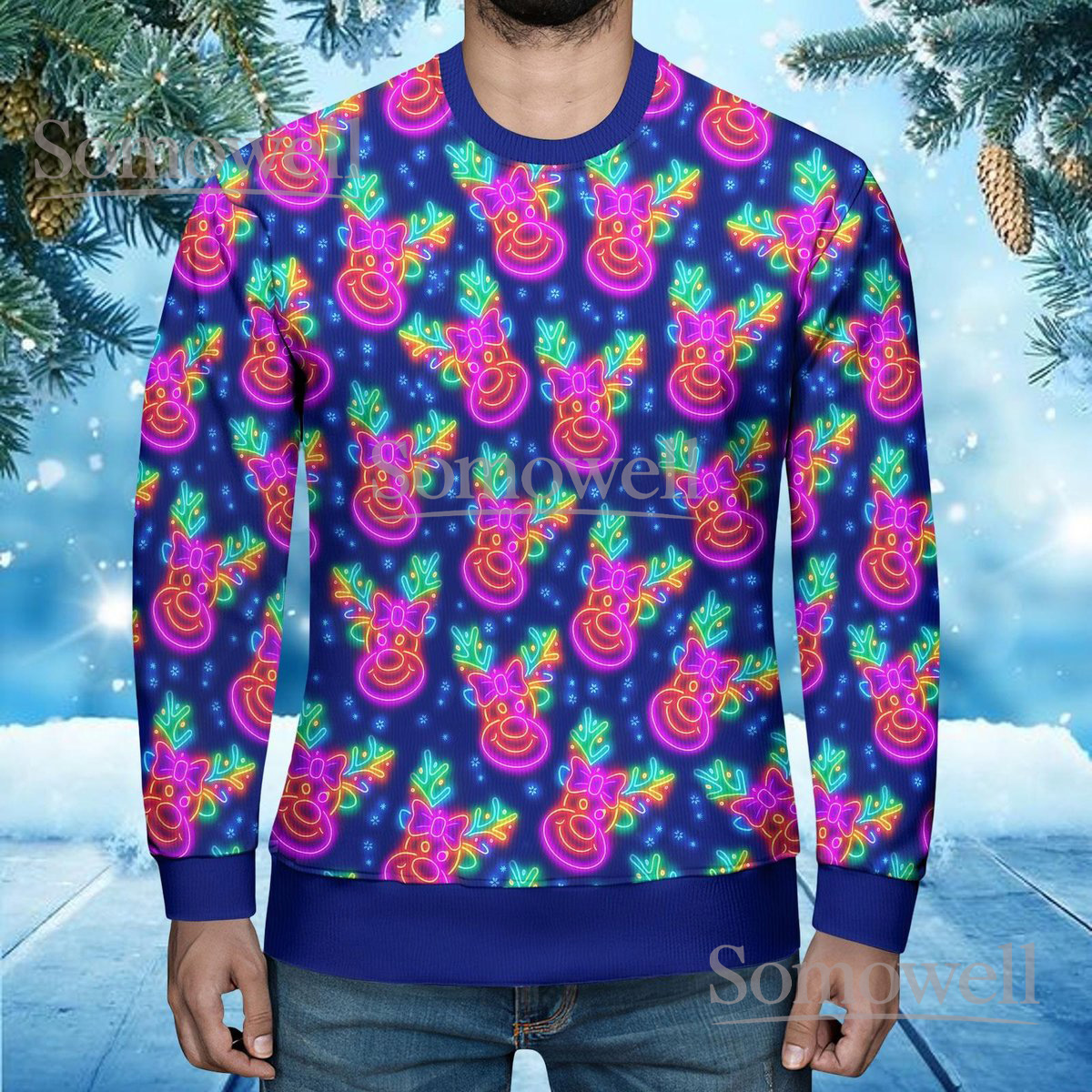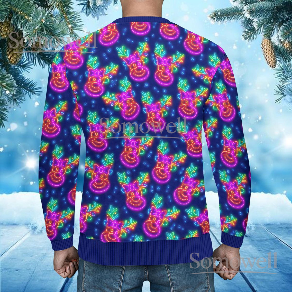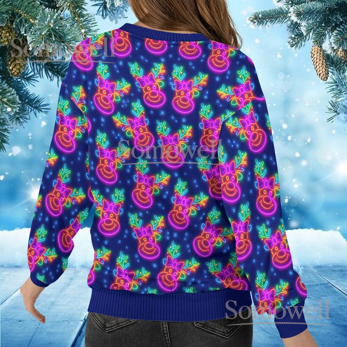 Neon Reindeer Ugly Christmas Sweater Funny Holiday Lights Print Knit Jumper Gift