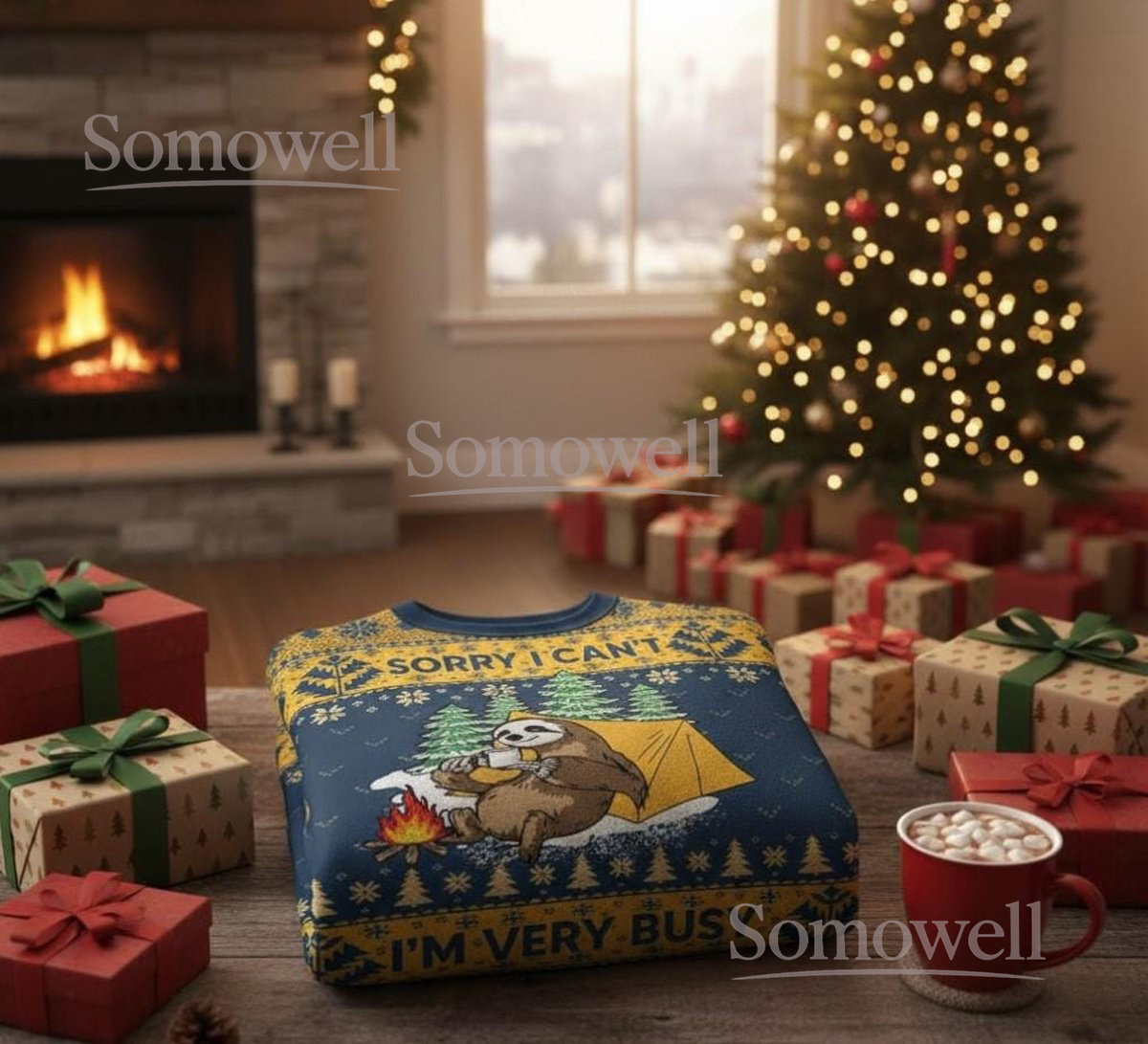 Sloth Busy Camping Christmas Blue Ugly Sweater Funny Holiday Knit Jumper