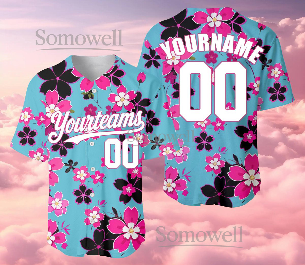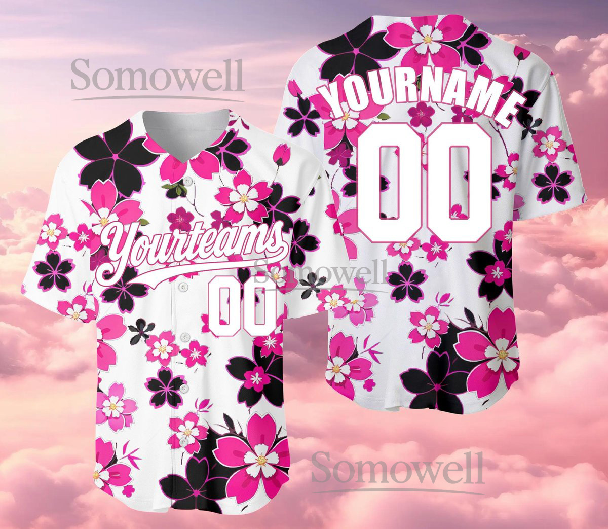 Cherry Blossom Baseball Jersey Black Pink Floral Print Custom Team Name Number Shirt