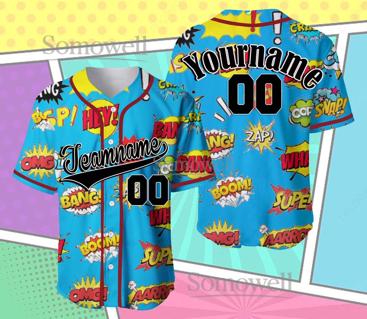 Comic Book Baseball Jersey with Team Name Number Multiple Color Options for Adult Kid