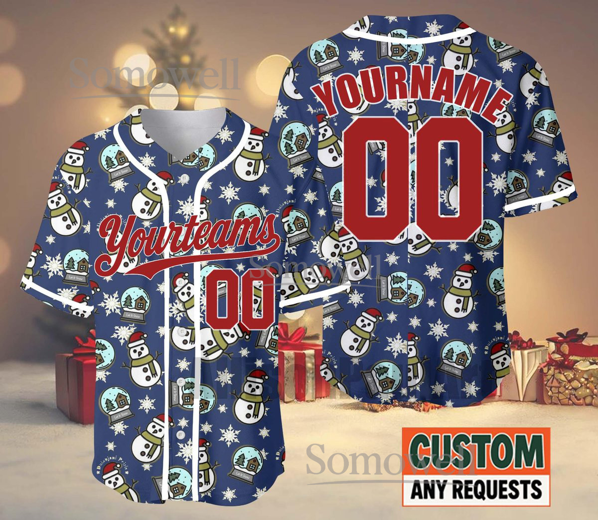 Custom Christmas Baseball Jersey Snow Globe Snowman Edition Available in Multiple Colors