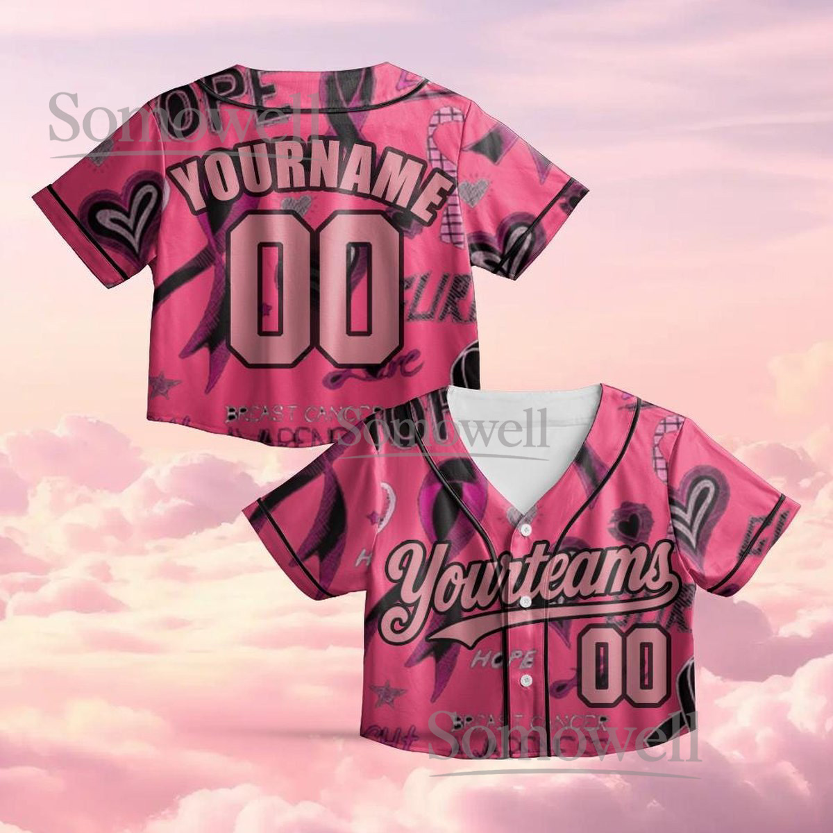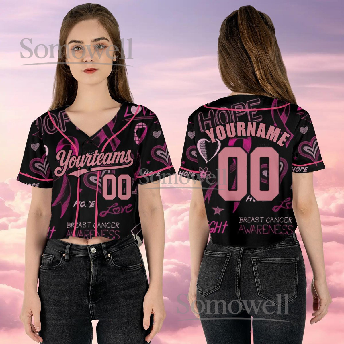 Custom Crop Pink Ribbon Baseball Jersey with Team Name and Number for Breast Cancer Awareness Campaign