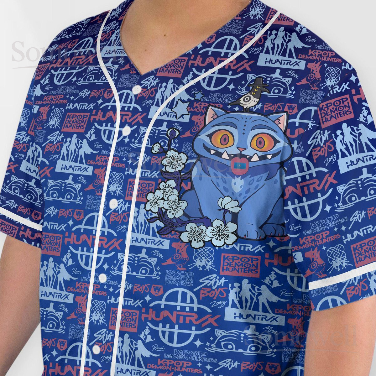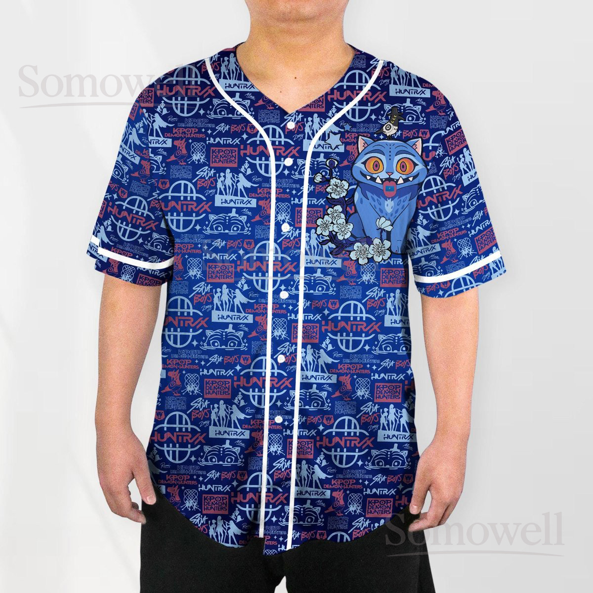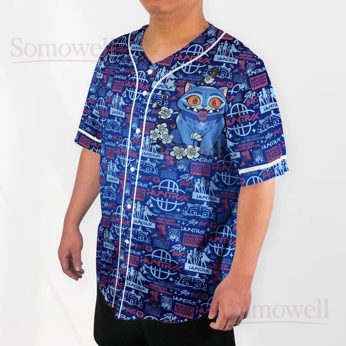 Custom Derpy Tiger Baseball Jersey Shirt for Animal Lovers Blue and Red Playful Cartoon Cat Design Gift Apparel