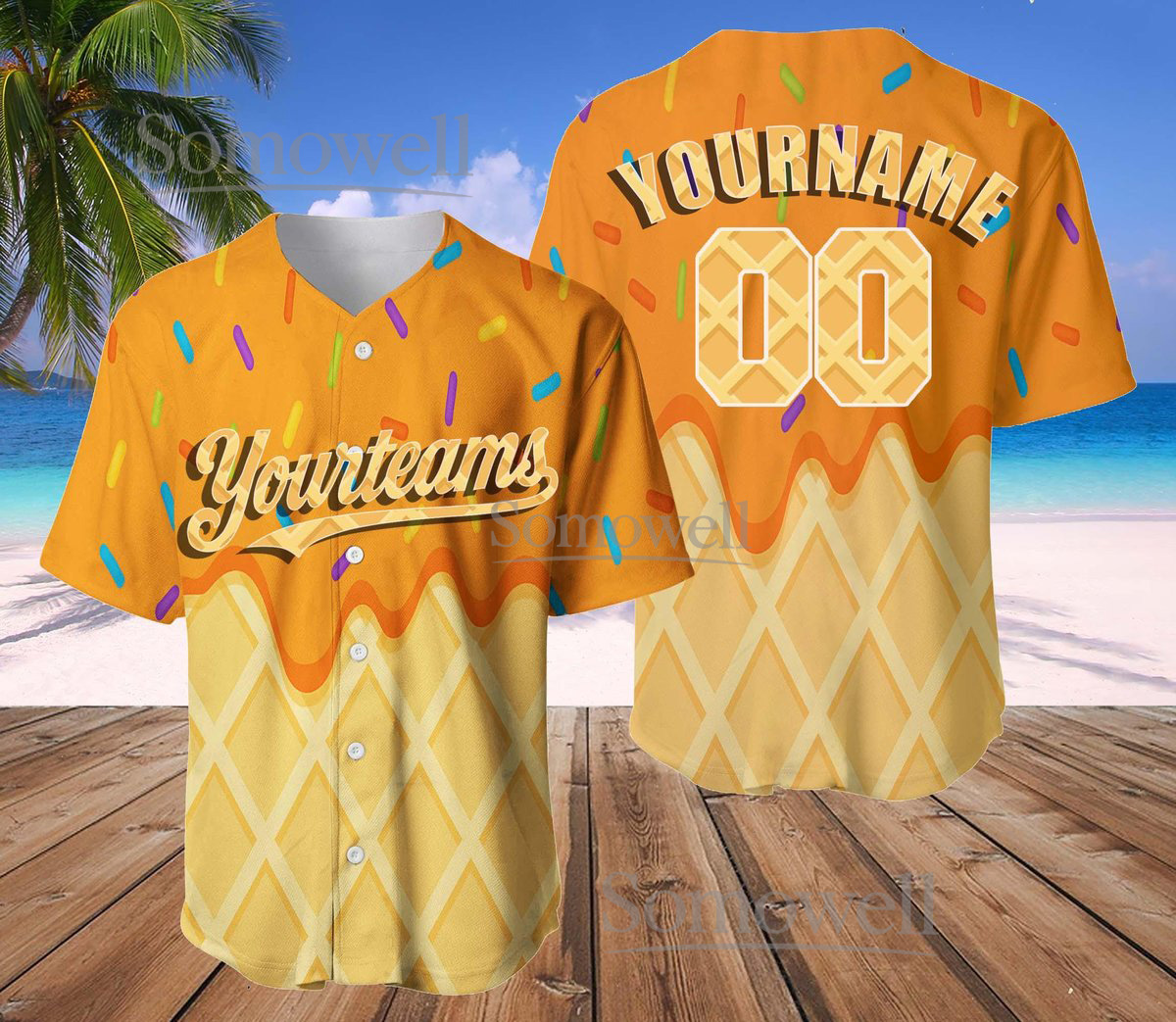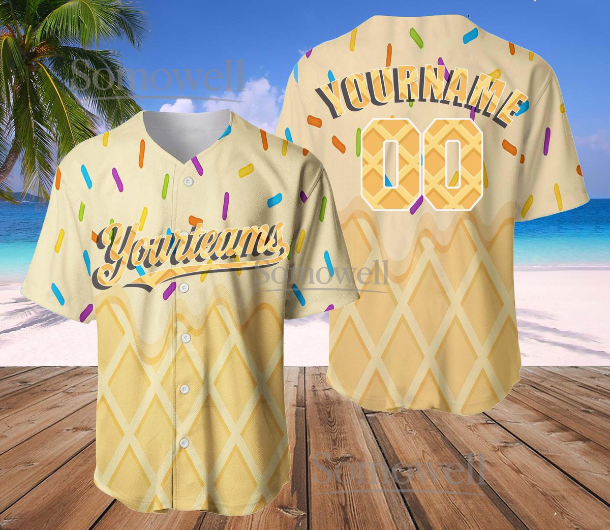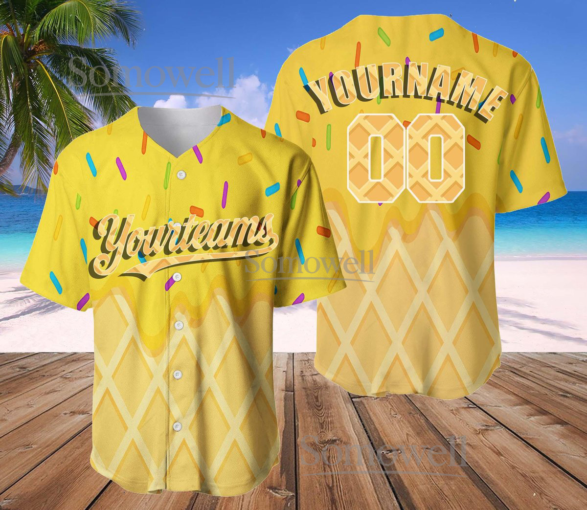 Custom Ice Cream Baseball Jersey Pink Yellow Waffle Cone Sprinkle Summer Team Name Number Shirt