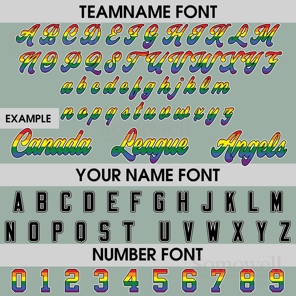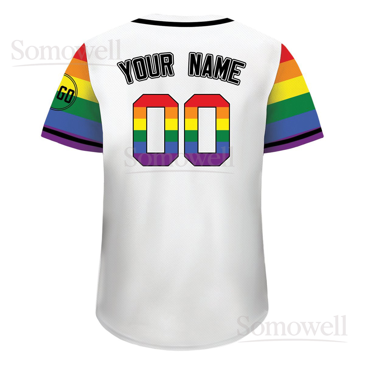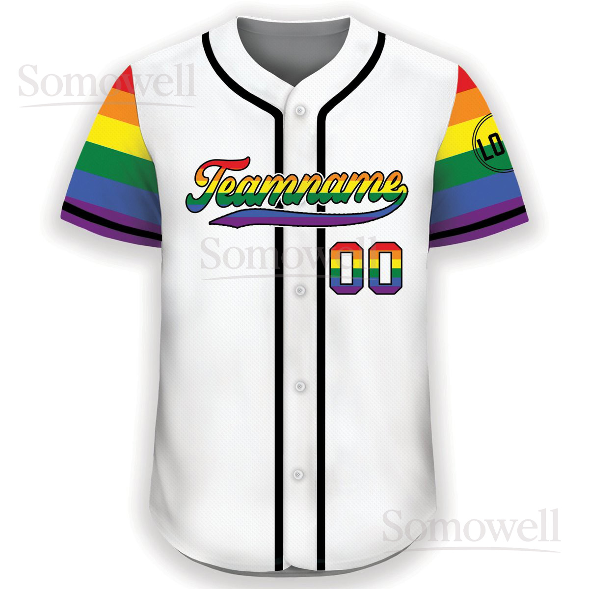 Custom LGBTQ Pride Month Baseball Jersey with Teamname Name and Number for Men and Women in Multiple Colors