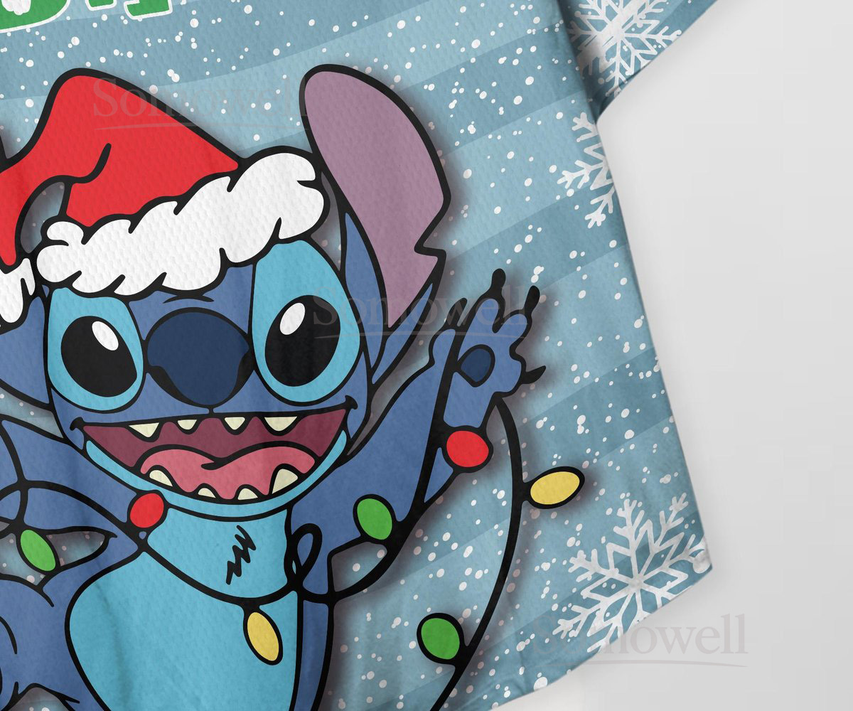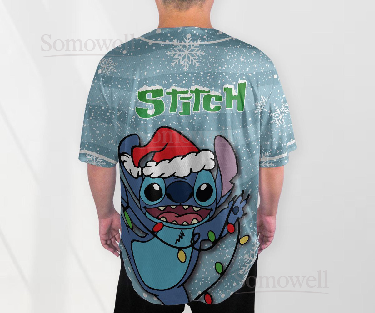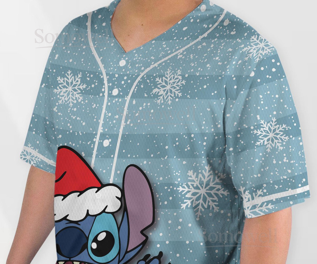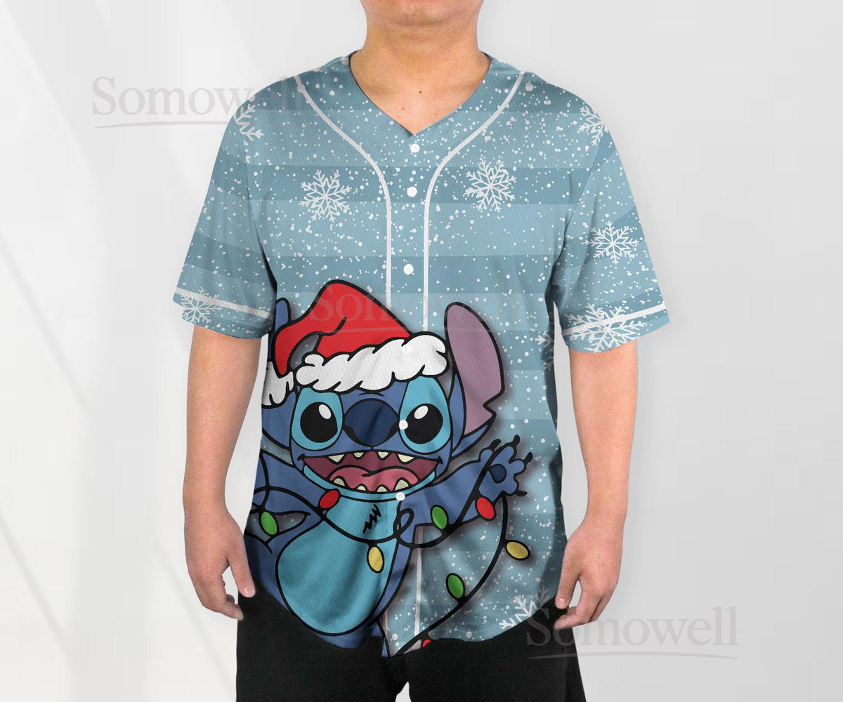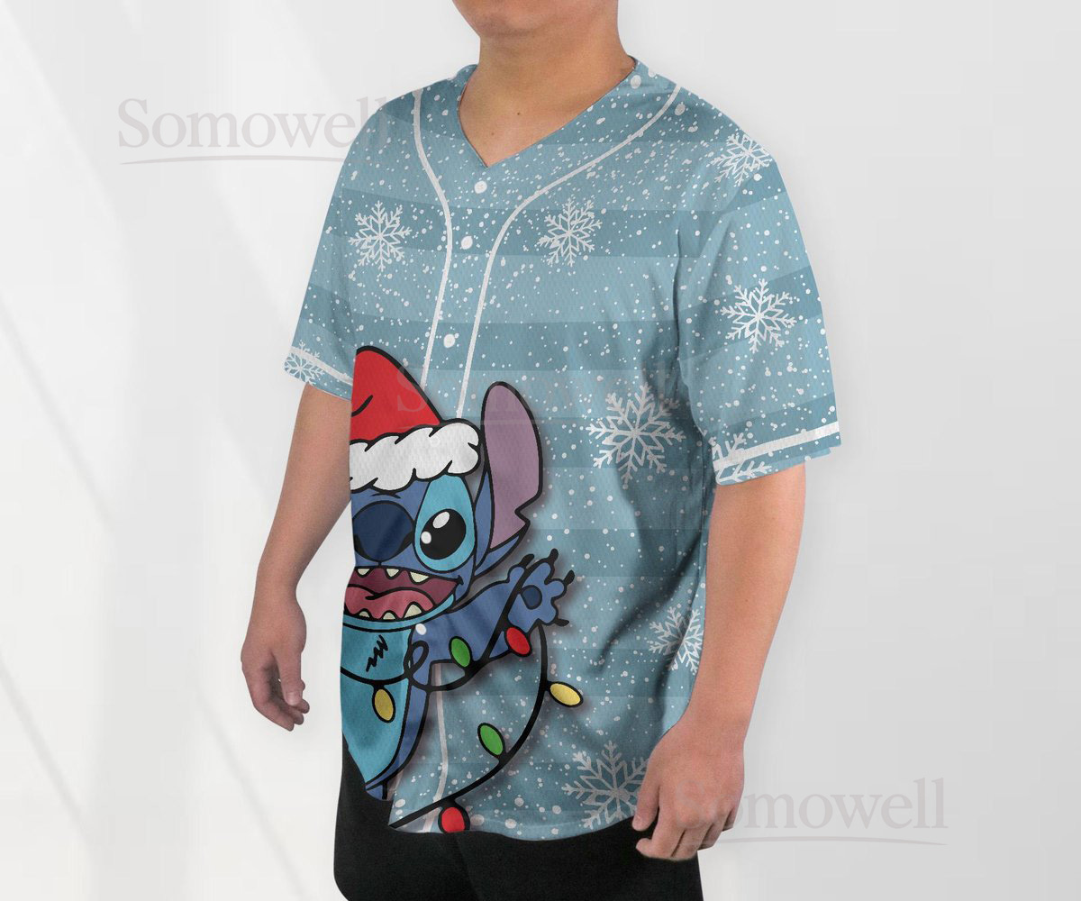 Custom Stitch Christmas Baseball Jersey Shirt for Disney Fans Blue Holiday Themed Gift Apparel with Lights Design