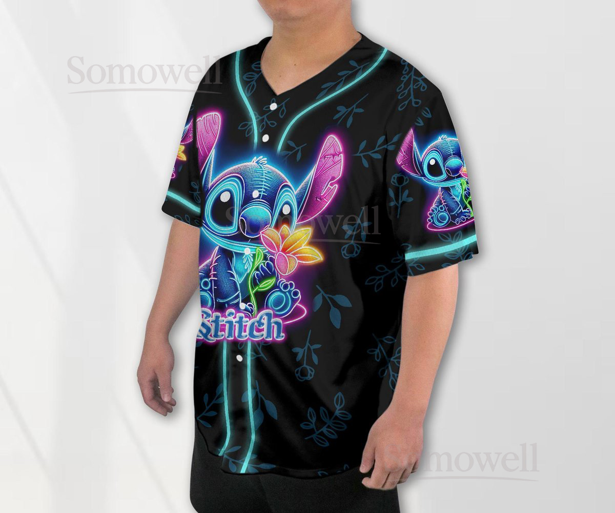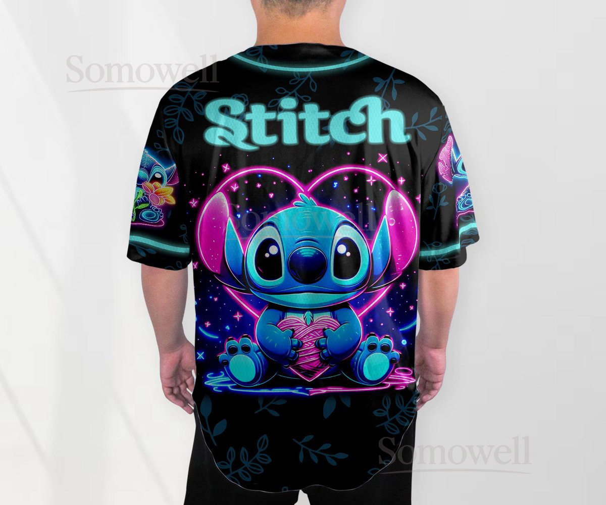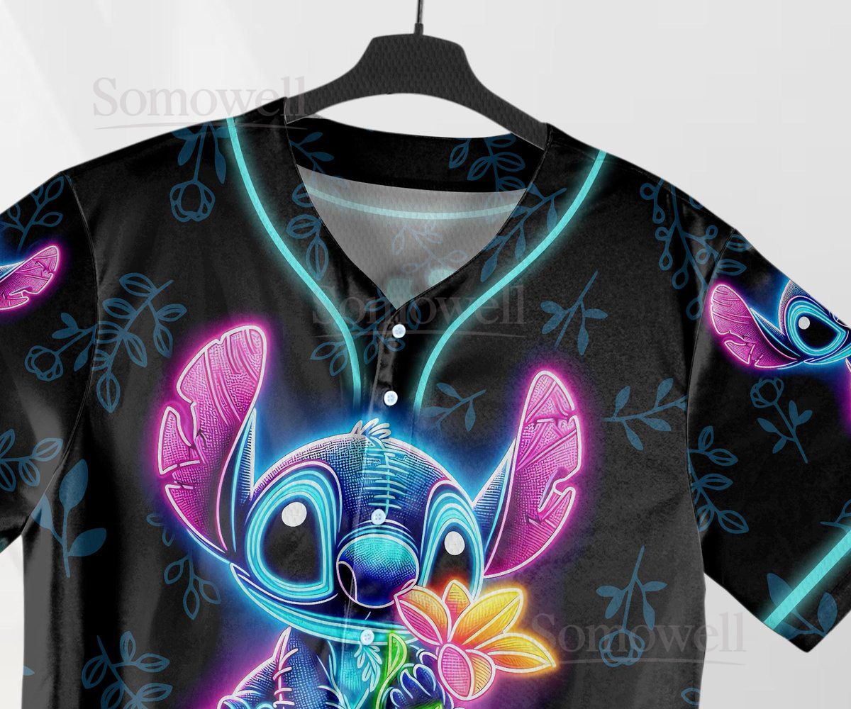 Custom Stitch Neon Baseball Jersey Shirt for Disney Fans Black Glow in the Dark Cute Cartoon Gift Apparel