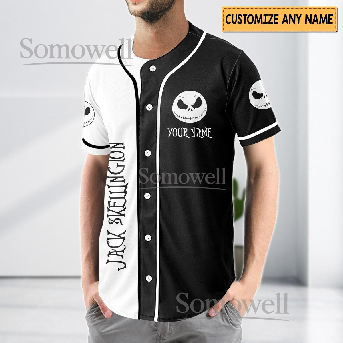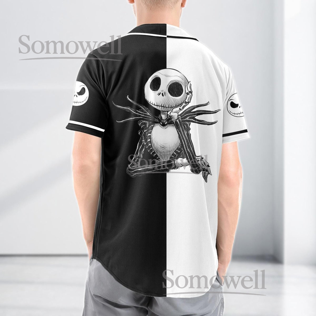 Jack Skellington Black White Split Baseball Jersey Halloween Gothic Custom Name Number Shirt