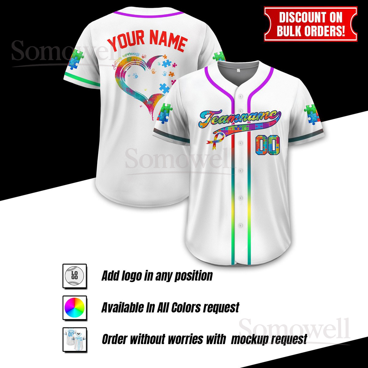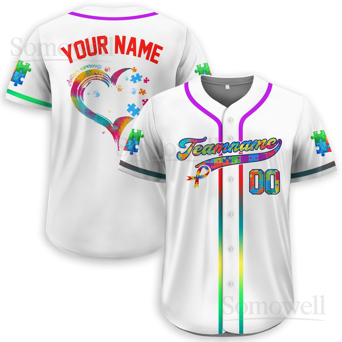 Personalized Autism Awareness Baseball Jersey Puzzle Heart Custom Team Name Number Shirt Multi Color Edition