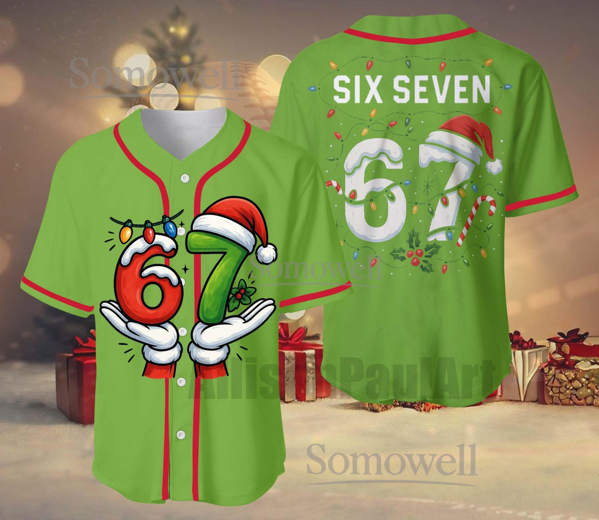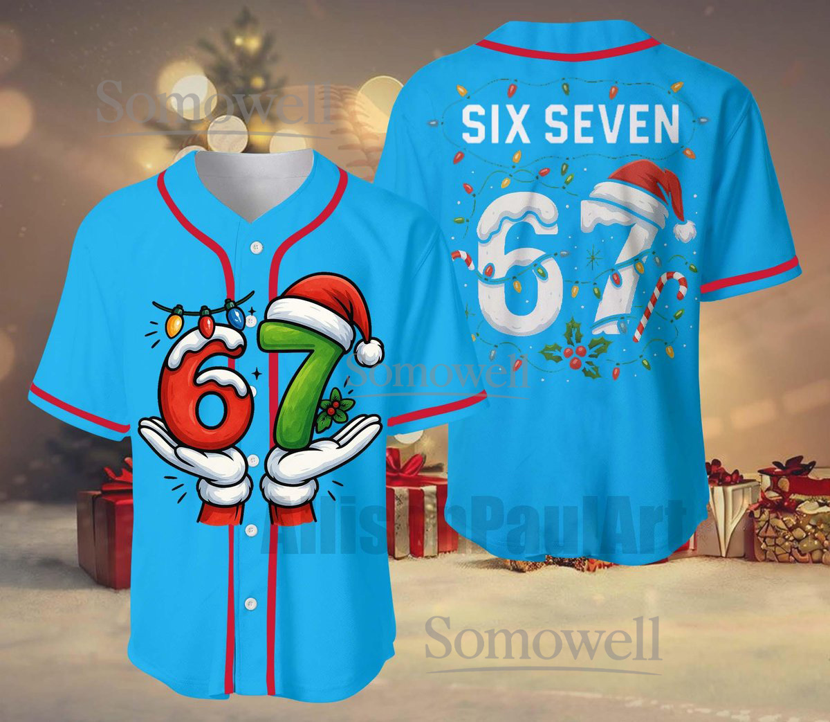 Six Seven Christmas Baseball Jersey Santa Lights Edition Available in Multiple Colors