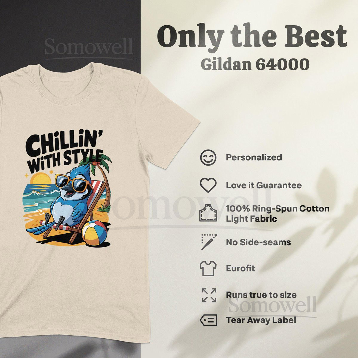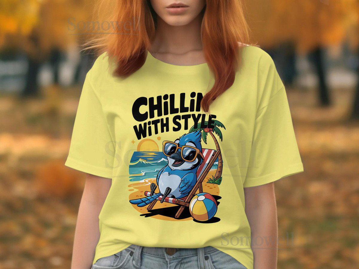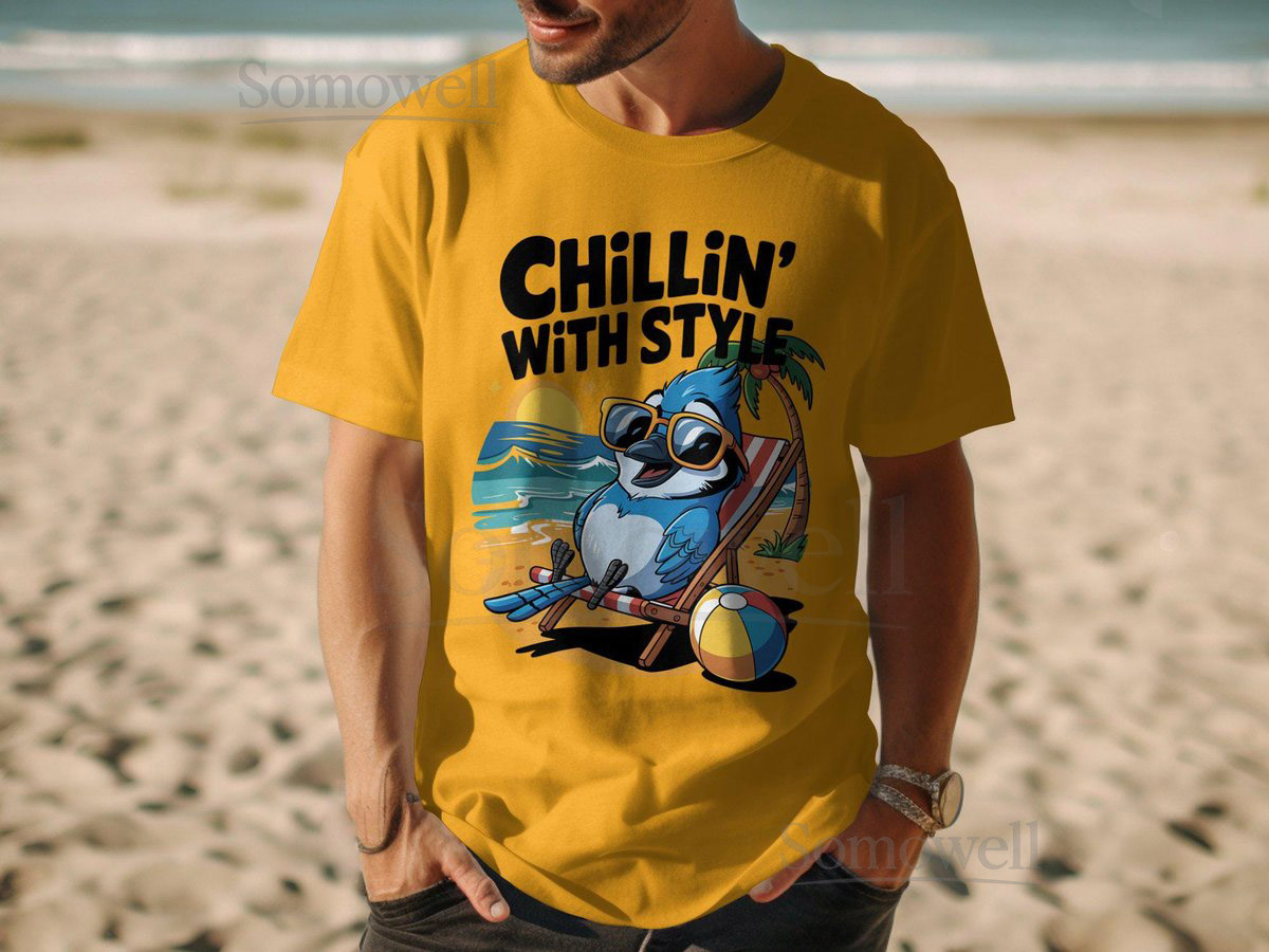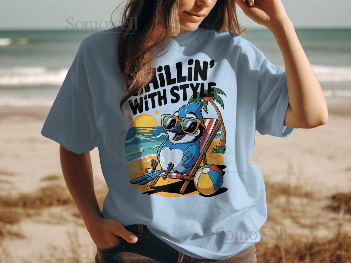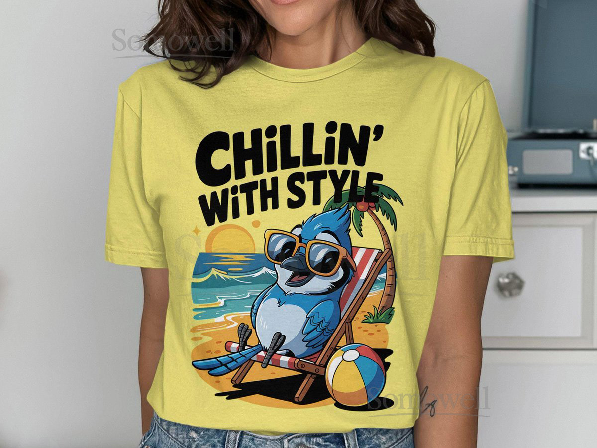 Chillin With Style Blue Jay Bird T Shirt Cartoon Beach Vacation Relax Summer Vibes Novelty Tee Trendy Graphic Design Tee_207