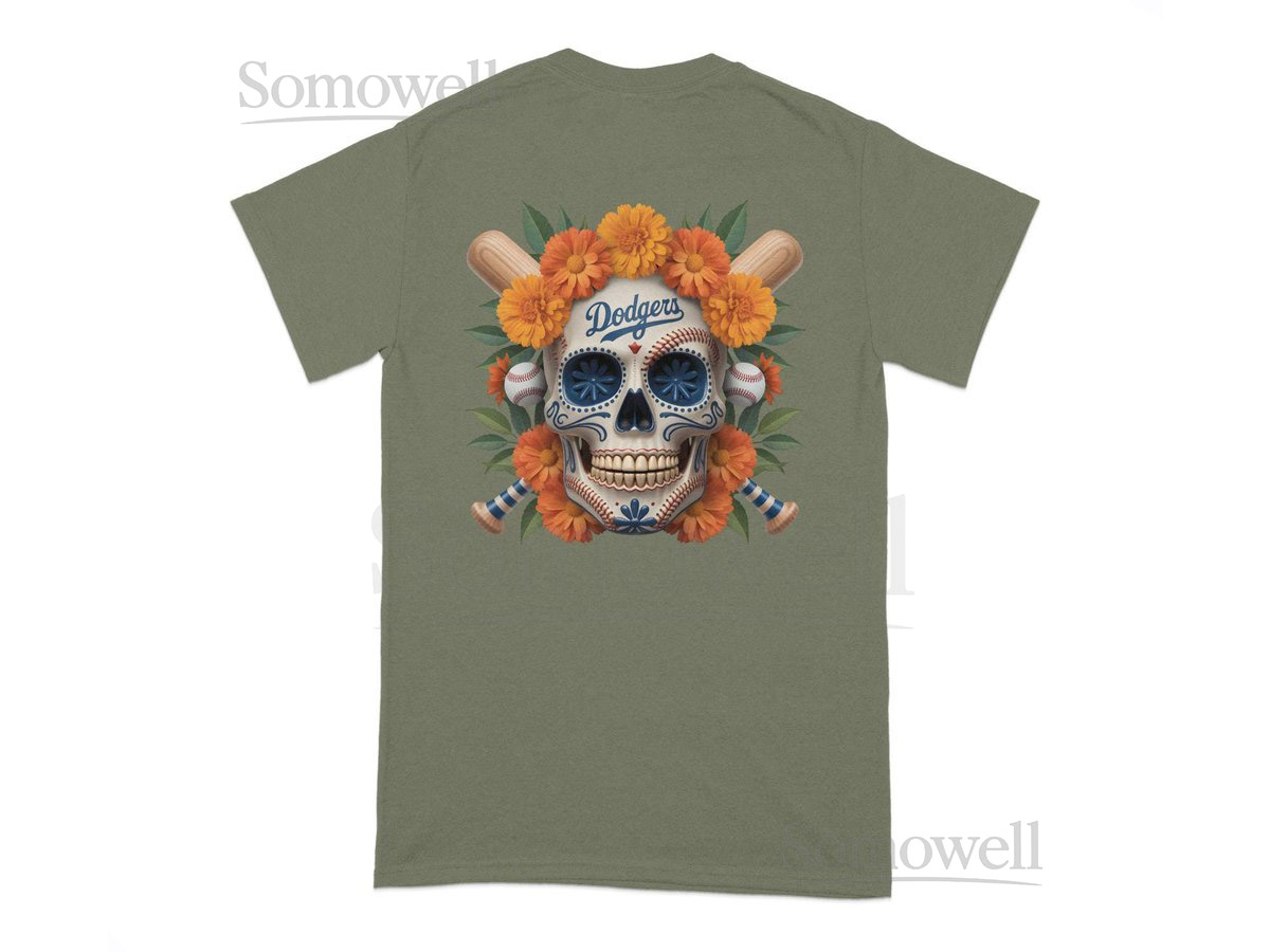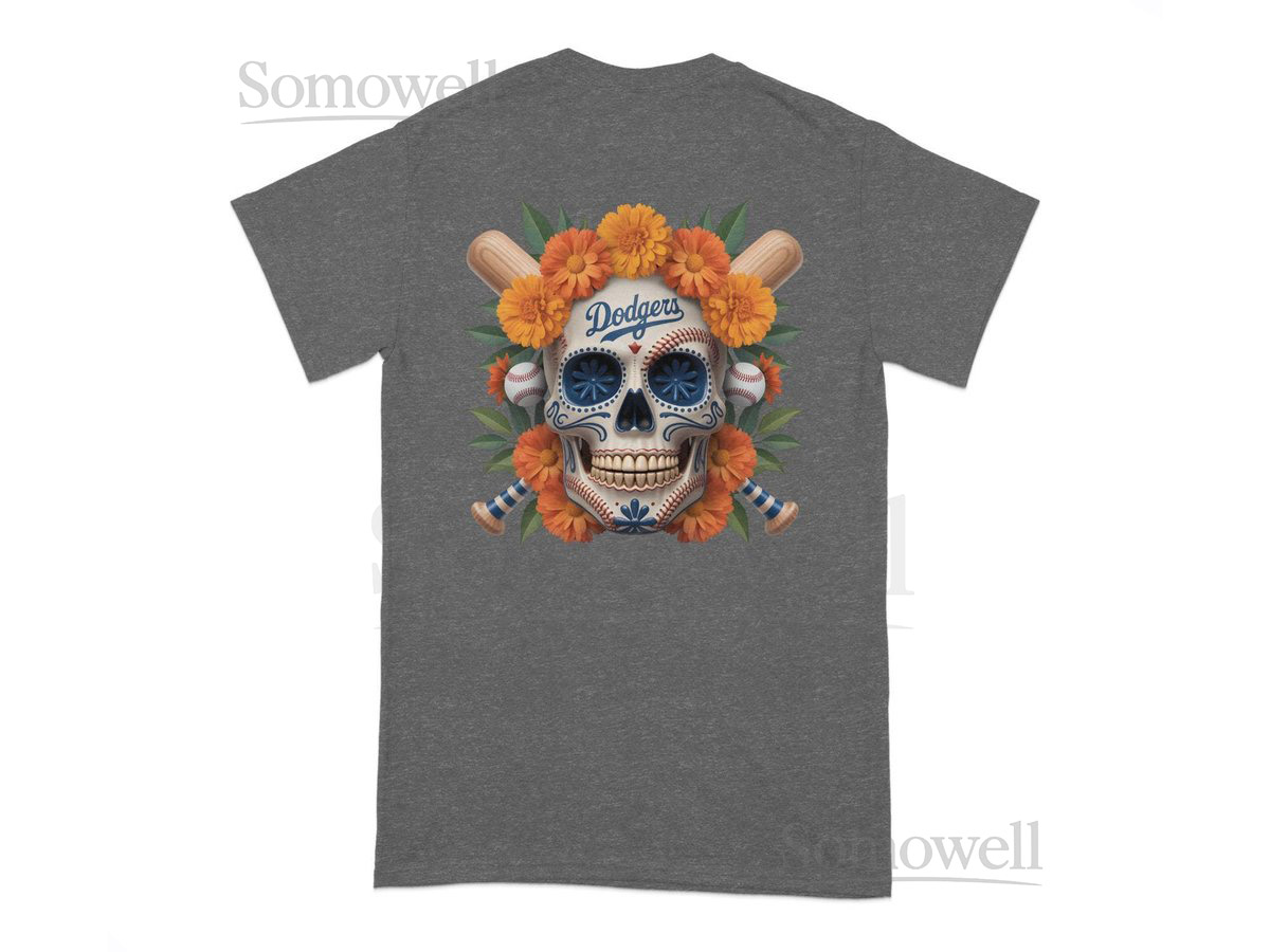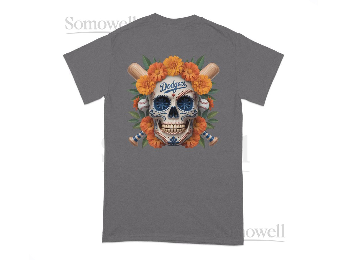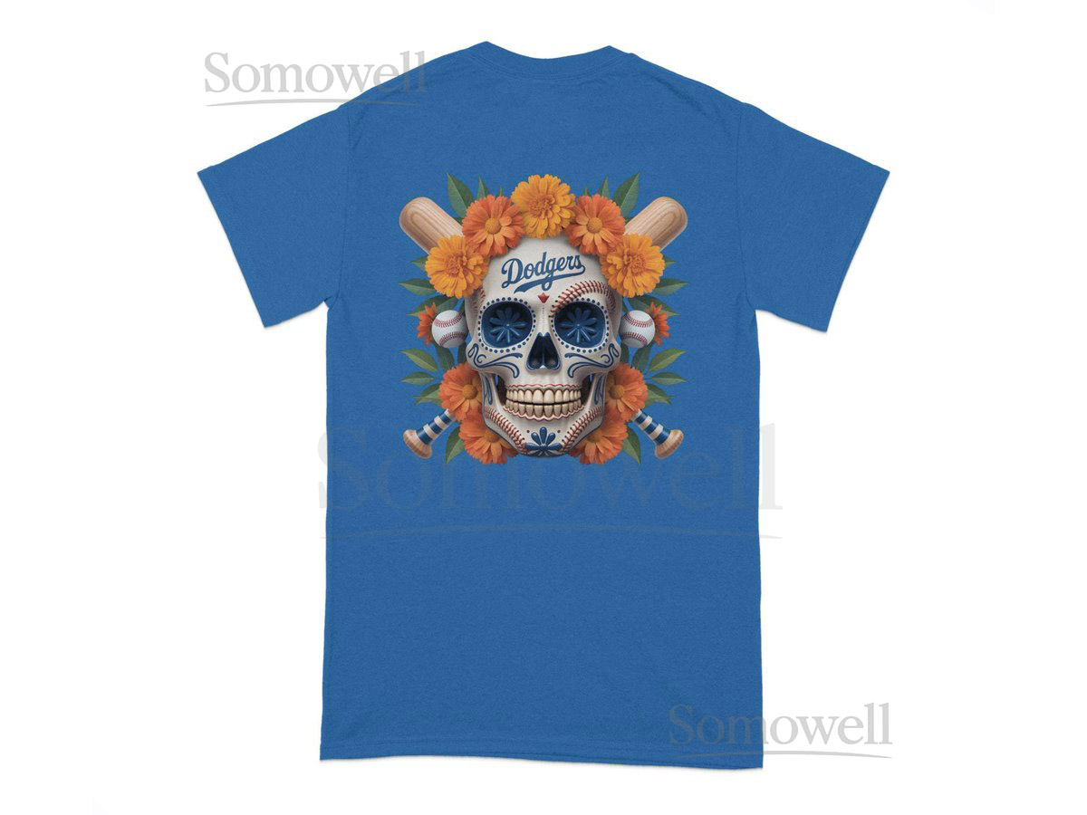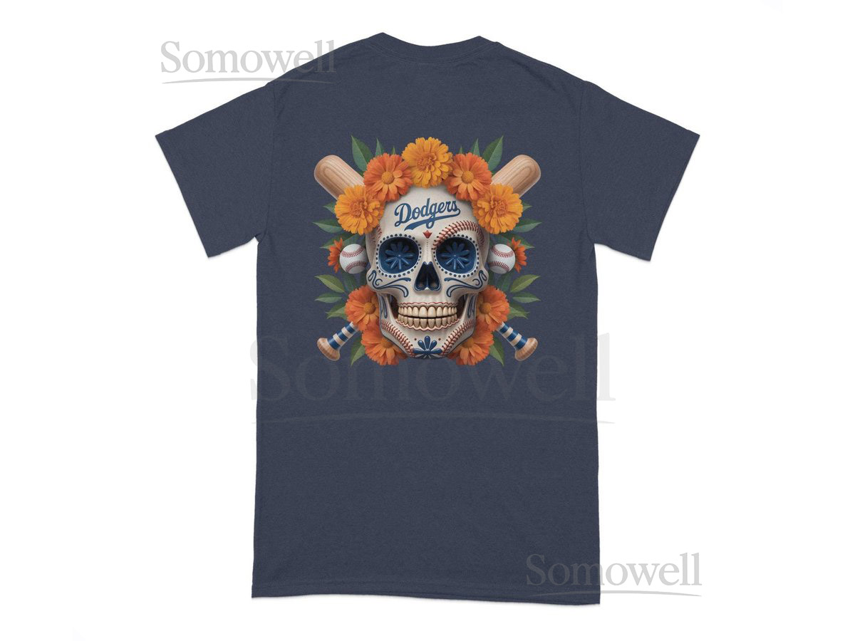 Dodgers Sugar Skull T-Shirt Day of the Dead Baseball Fan Gift Dia de los Muertos Dodgers Fan Tee Floral Skull Baseball T-Shirts_359