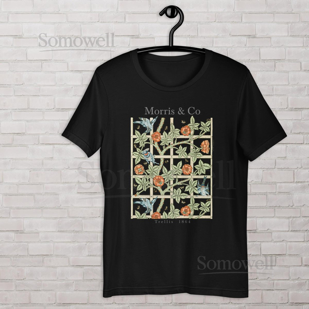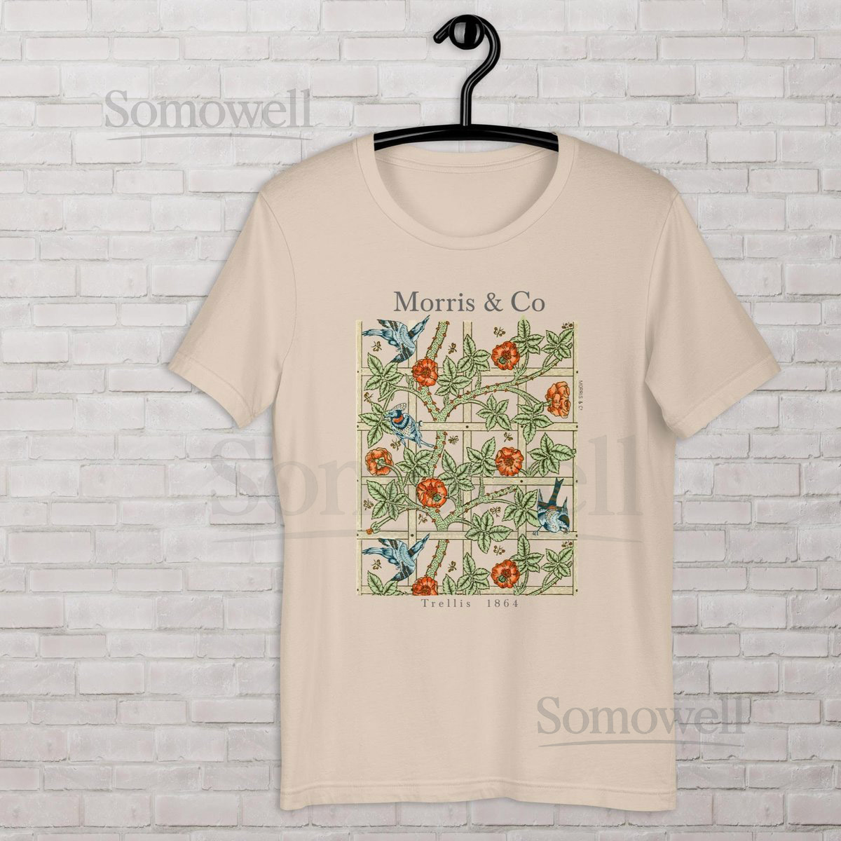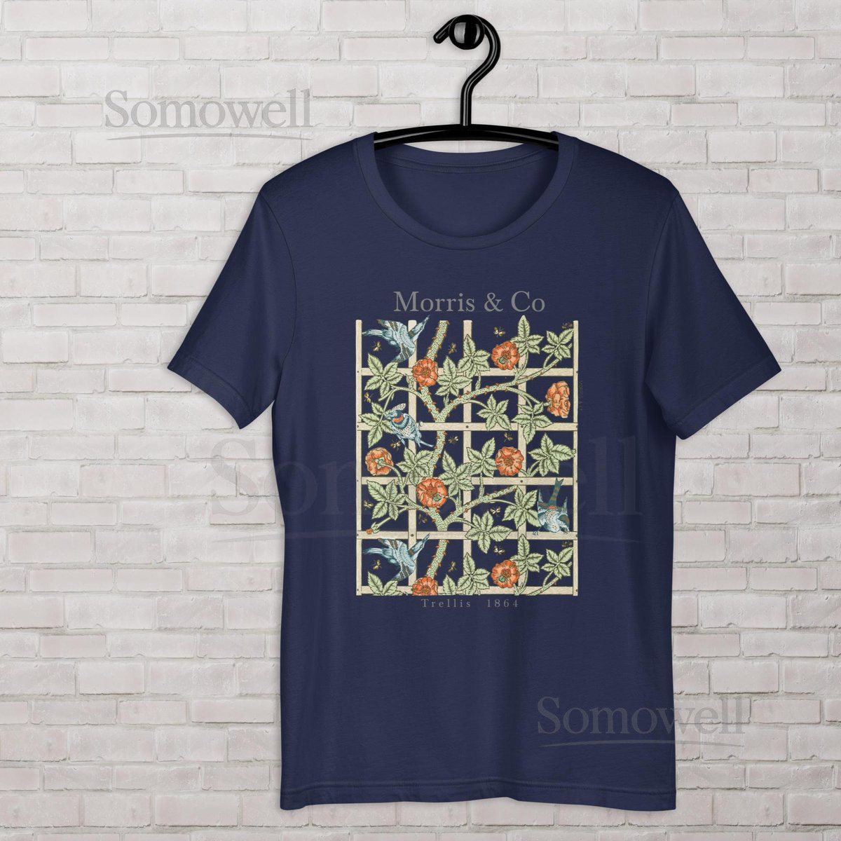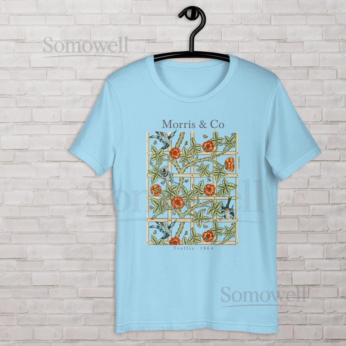 UnisexT-Shirt design William Morris Trellis Pattern Blue Birds and Pink Roses bush Vintage flowers shirt Cottagecore Tee plants Tee_955